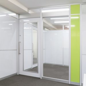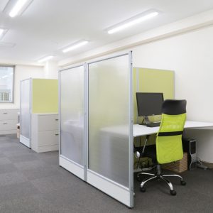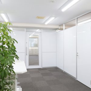作業スペースに半透明パーテーションを使用することで、仕切りを生みつつも圧迫感の無い、ゆとりの感じられる空間を実現いたしました。