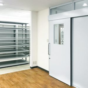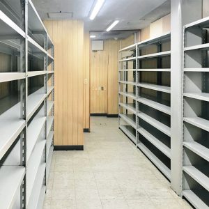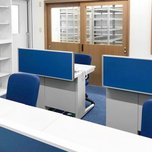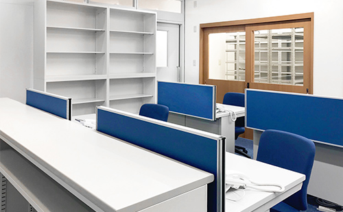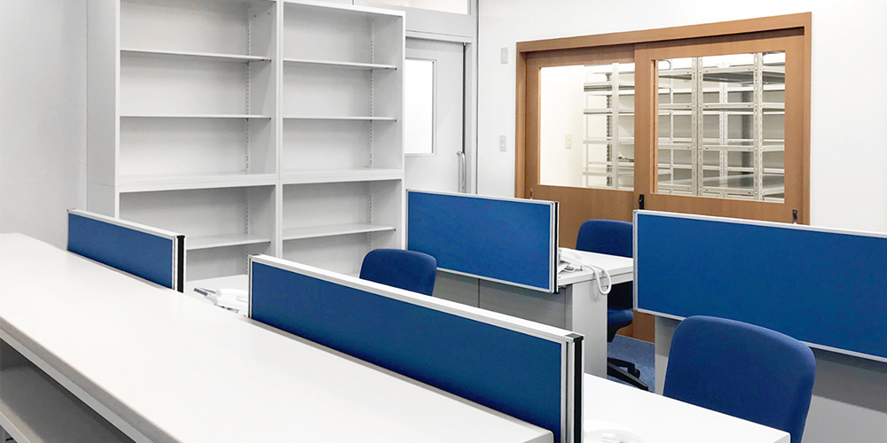 事務スペースは動線を確保しつつ、書庫等必要な物の配置も含めたレイアウトを提案いたしました。