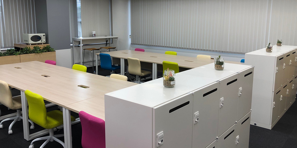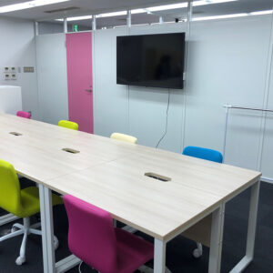 スタッフコメント お客様のご要望を叶えるため、アルミパーテーションを用いて機能的な空間分けを行いました。パーテーションには鮮やかな配色を採用し、オフィス全体に活気を与えています。共用のMTGスペースは、両社の社員が自然と交流できるよう開放的な雰囲気に仕上げました。什器には、お客様のイメージに合わせたカラフルな色合いを選定し、ワクワクするようなオフィス空間を演出しています。