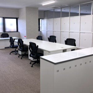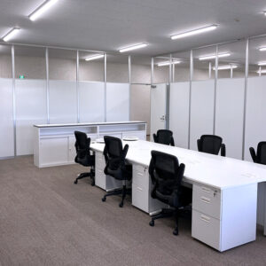 スタッフコメント オフィスデザインは、単に美しさや快適さを追求するだけでなく、業務の効率化や生産性向上にも大きな影響を与えます。今回の事例では、お客様の事業内容や要望を丁寧にヒアリングし、それに基づいたレイアウト提案を行うことで、スタッフの動線を最適化し、仕事がスムーズに進められる環境づくりを目指しました。ホワイトを基調とした明るく清潔感のある空間デザインは、集中力を高め、コミュニケーションを促進する効果も期待できます。また、施工型パーテーションとの色調統一により、オフィス全体の一体感を演出しています。私たちは、お客様一人ひとりのニーズに寄り添い、それぞれの業務特性に合わせた最適なオフィス空間をご提供いたします。ぜひ、貴社のオフィスづくりについてもご相談ください。