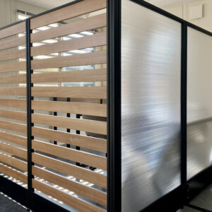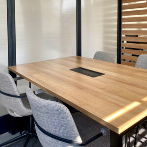 提案したオフィスは、ブラック×木目×グレーを基調にした、カフェ風のおしゃれなデザインとなっており、光を遮らないラダーと半透明のパーテーションで仕切ることにより、開放感のある会議室が実現しました。
