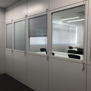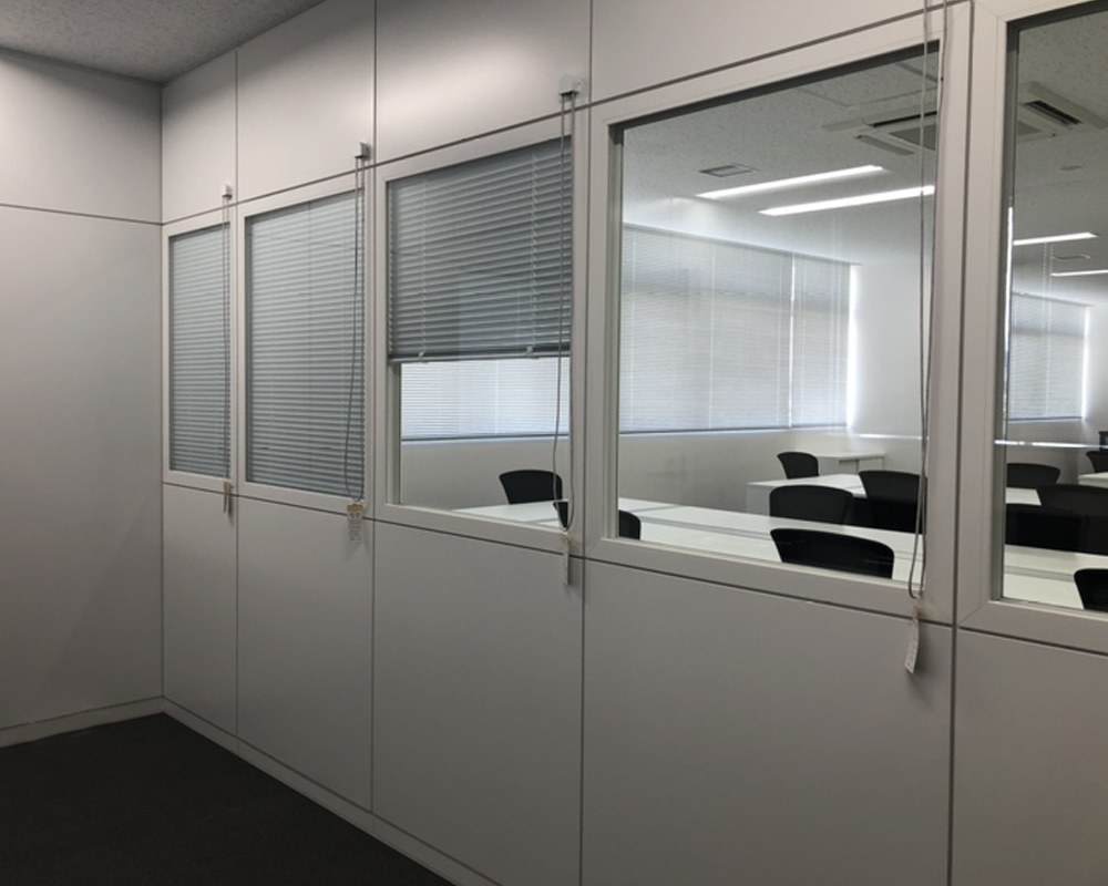 会議室にはスチールパーテーションを採用し、執務室側にはブラインド内蔵型を設置するプランをご提案。