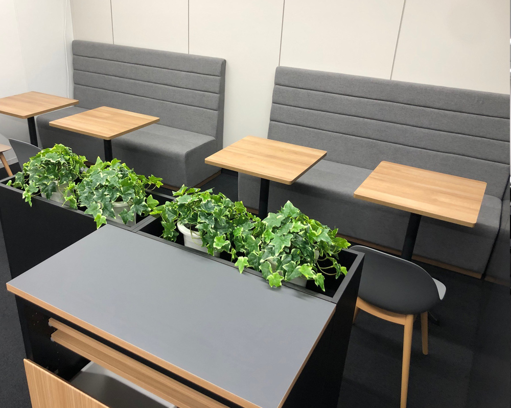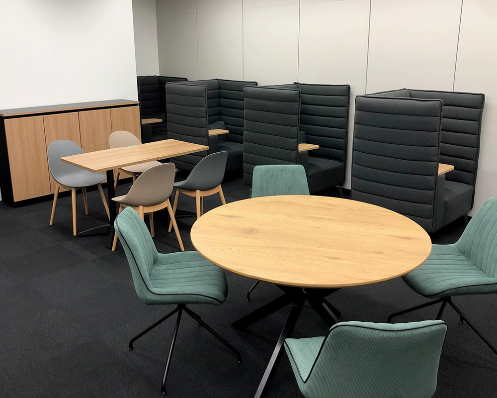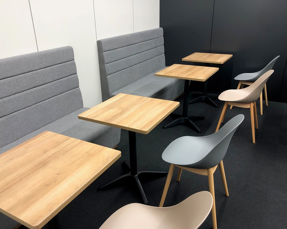 また、ファミレスベンチ(対面・片面)やスクエア型の個人席、丸テーブルなどを組み合わせ、限られたスペースの中でも快適に過ごせるレイアウトをご提案しました。
