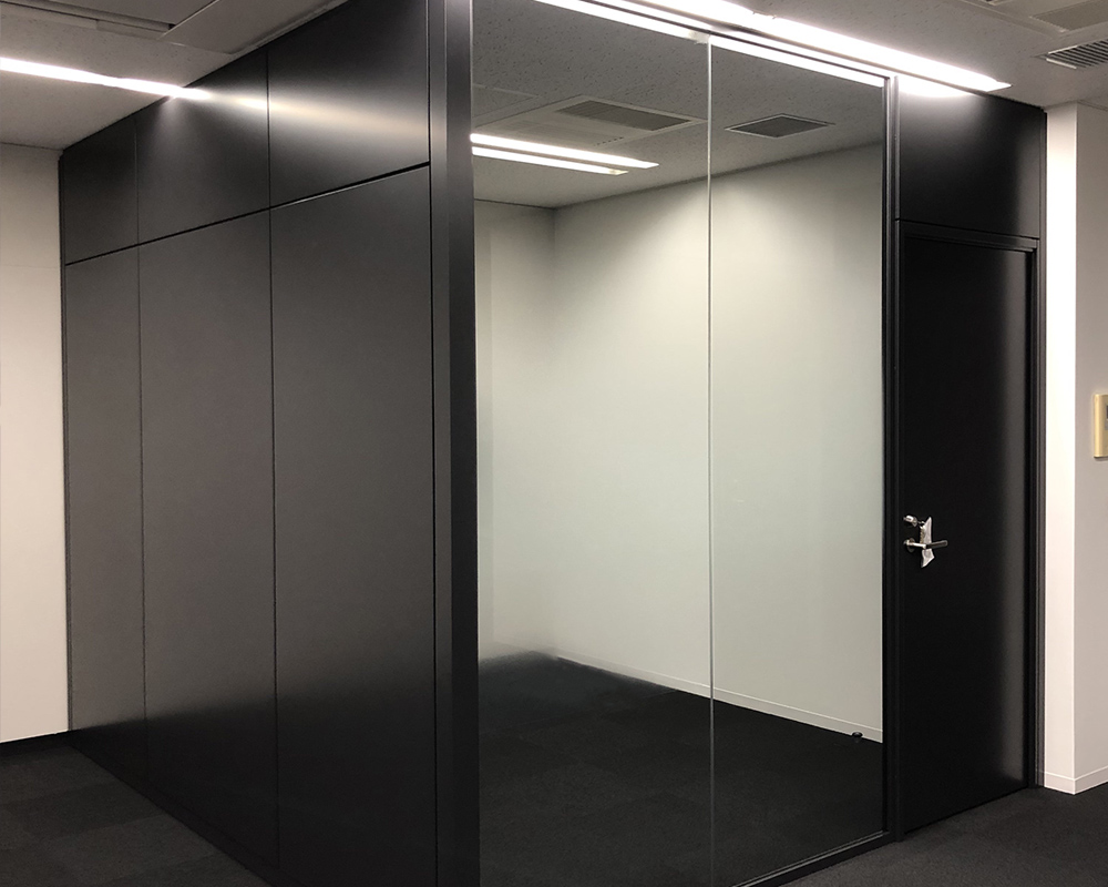 弊社からのご提案 L字レイアウトに合わせ、片側には遮音材入りのパネル、もう片側にはフルガラス+グラデーションフィルムを採用し、空間に抜け感とプライバシーを両立させました。