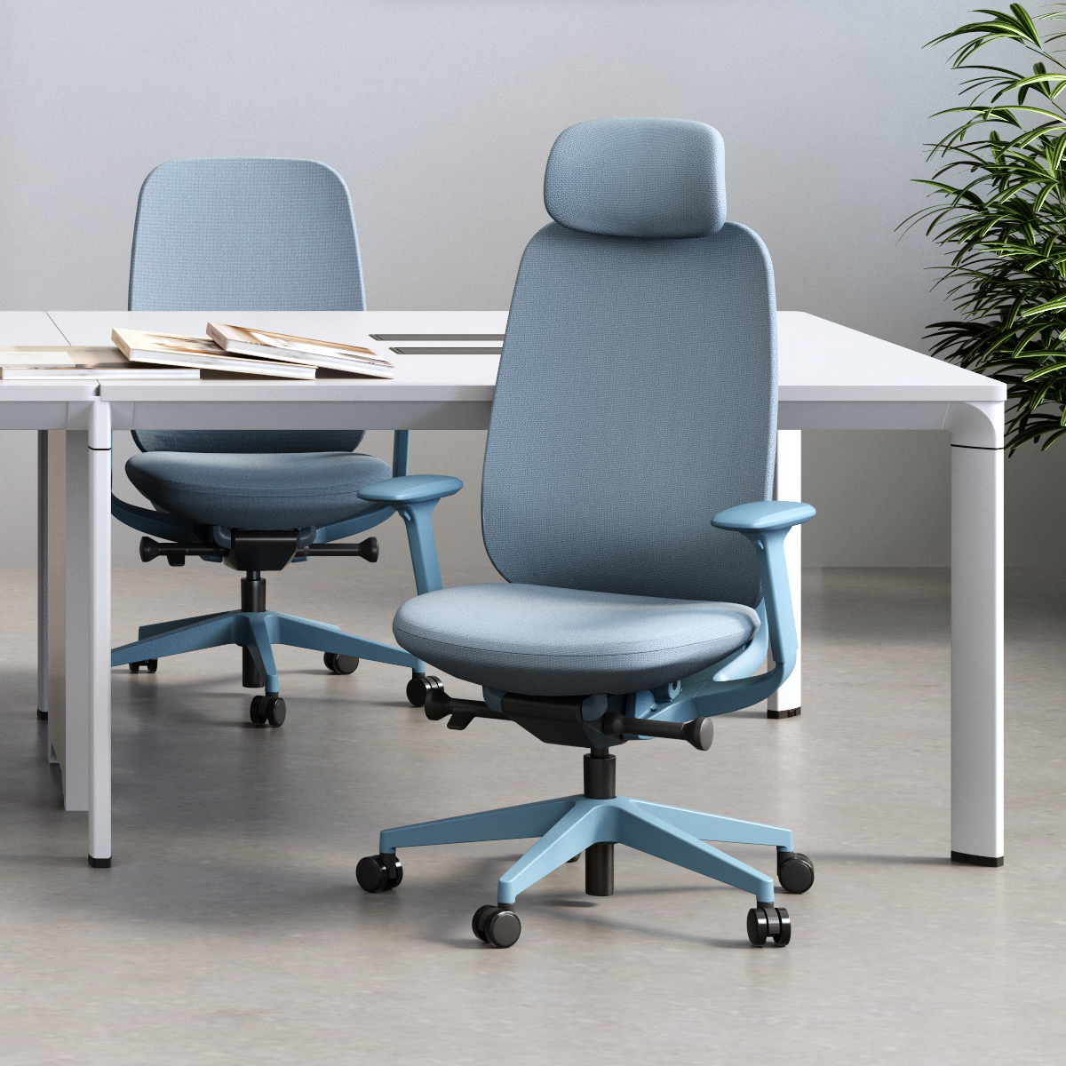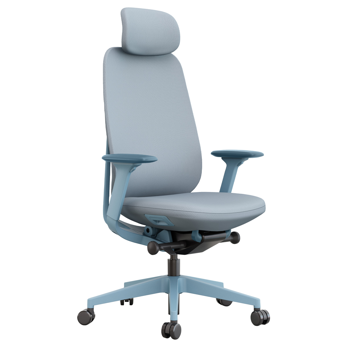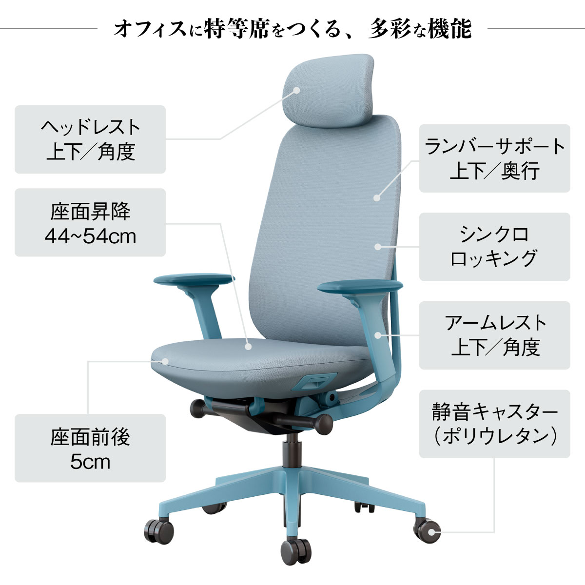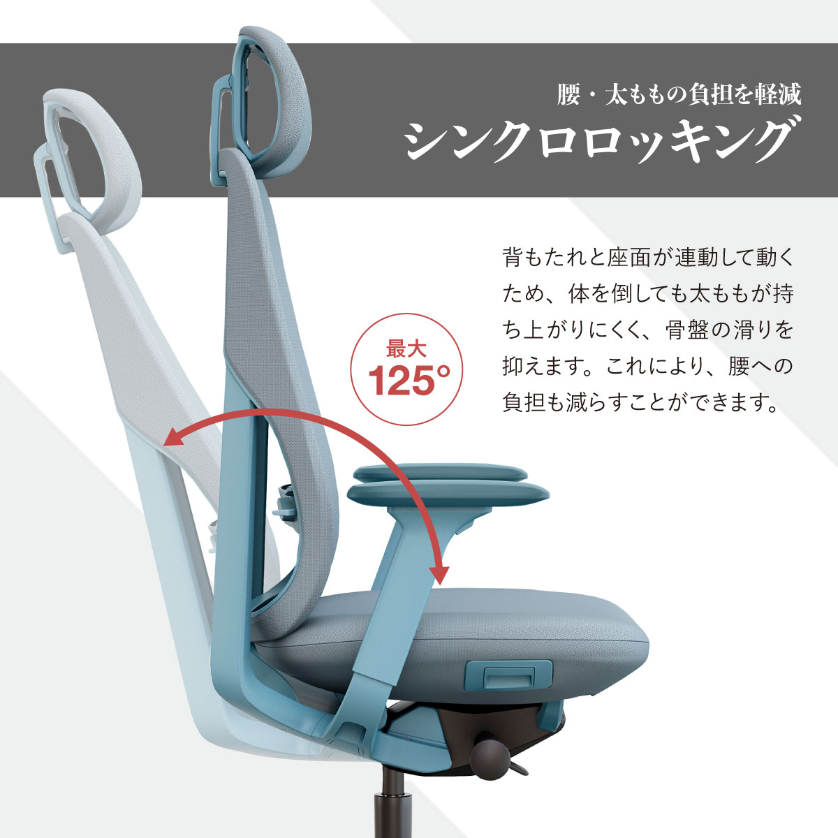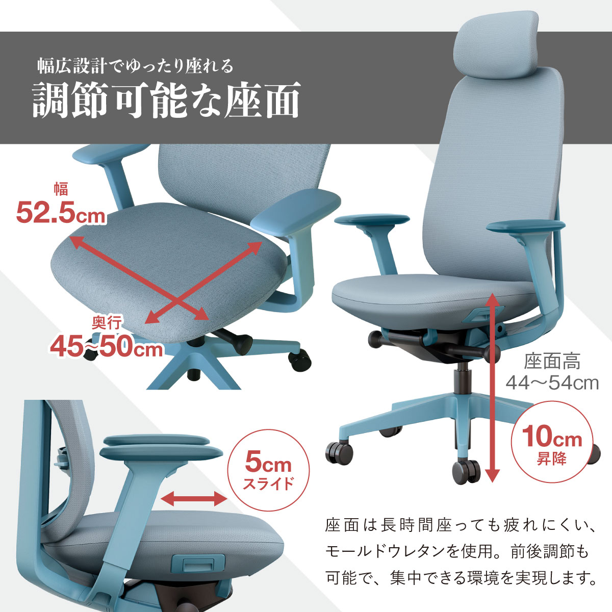座面には長時間の着座でも快適な座り心地をもたらすモールドウレタンを使用、4D可動肘、座奥行き調整、シンクロロッキング機構、ヘッドレスト、ランバーサポートなど、姿勢に合わせて細かく調整できる機能が、使用者の集中力と生産性を高めます。