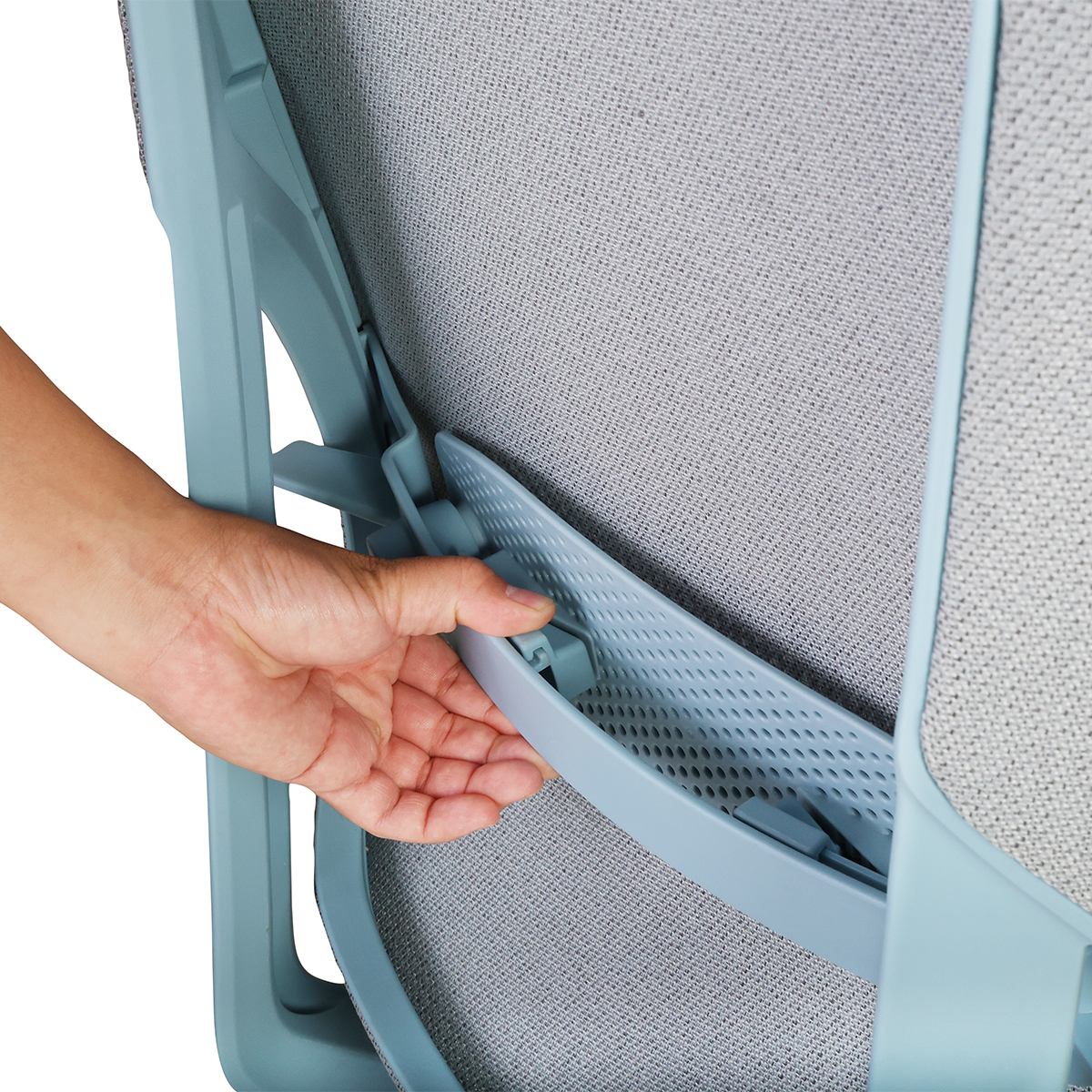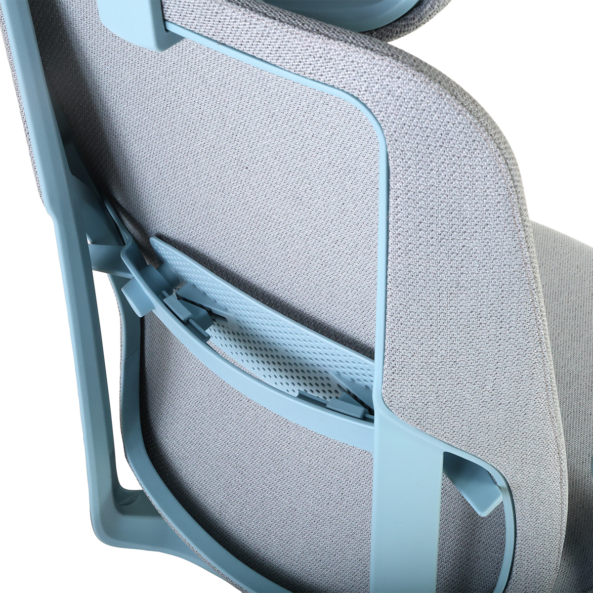 背骨のS字カーブに合わせて、最適な位置と反発力を調整できるランバーサポートが、長時間のデスクワークでも快適な姿勢を保つのを助けます。