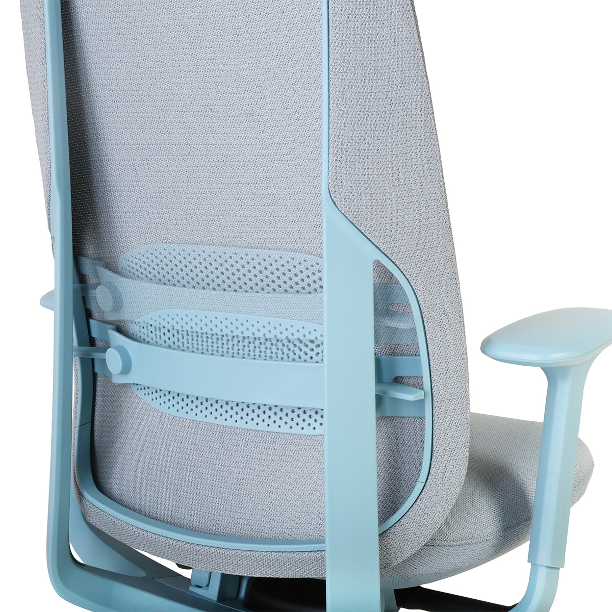 通気性と柔らかな質感を両立した背面のメッシュ張地と、美しいフレームラインが、オフィス空間のどこに置いても映えるデザイン性を誇ります。