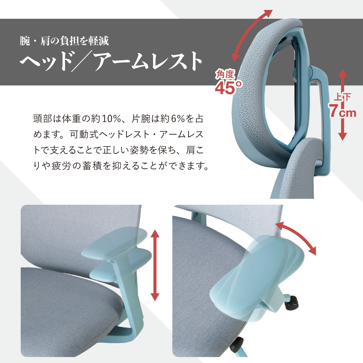 上下、前後、左右、そして角度まで、常に最適なポジションで腕を支える4D可動の肘掛けが、間接的に肩や首への負担を和らげサポートします。
