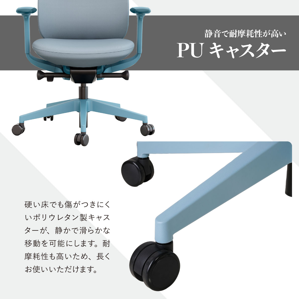 フローリングなどの硬い床でも傷がつきにくいポリウレタン製キャスターが、静かで滑らかな移動を可能にすることにより、仕事の集中を妨げません。
