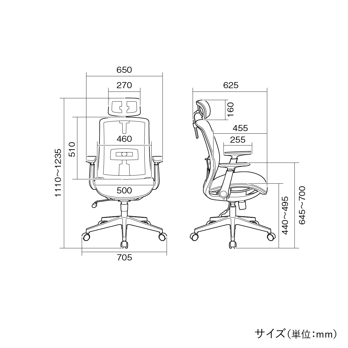 サイズ | W650×D625×H1110-1235mm 座面高:440-495mm 脚:W705mm |
