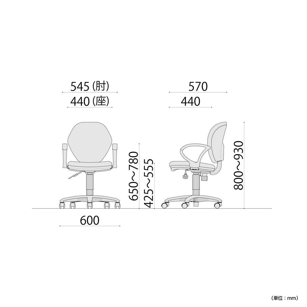 | サイズ | 肘無し:W440×D570×H800-930mm 肘付き:W545×D570×H800-930mm 座面高:425-555mm |