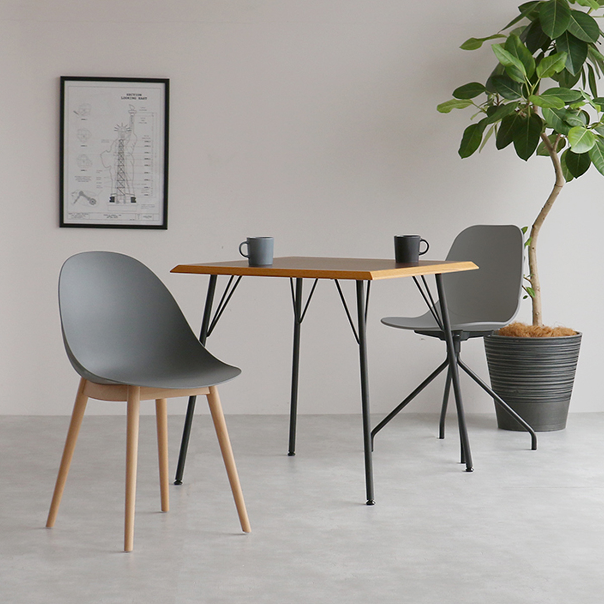 スリムなスチールレッグと、くすみカラーの独特な形状のシートの組み合わせがモダンな印象を与えます。