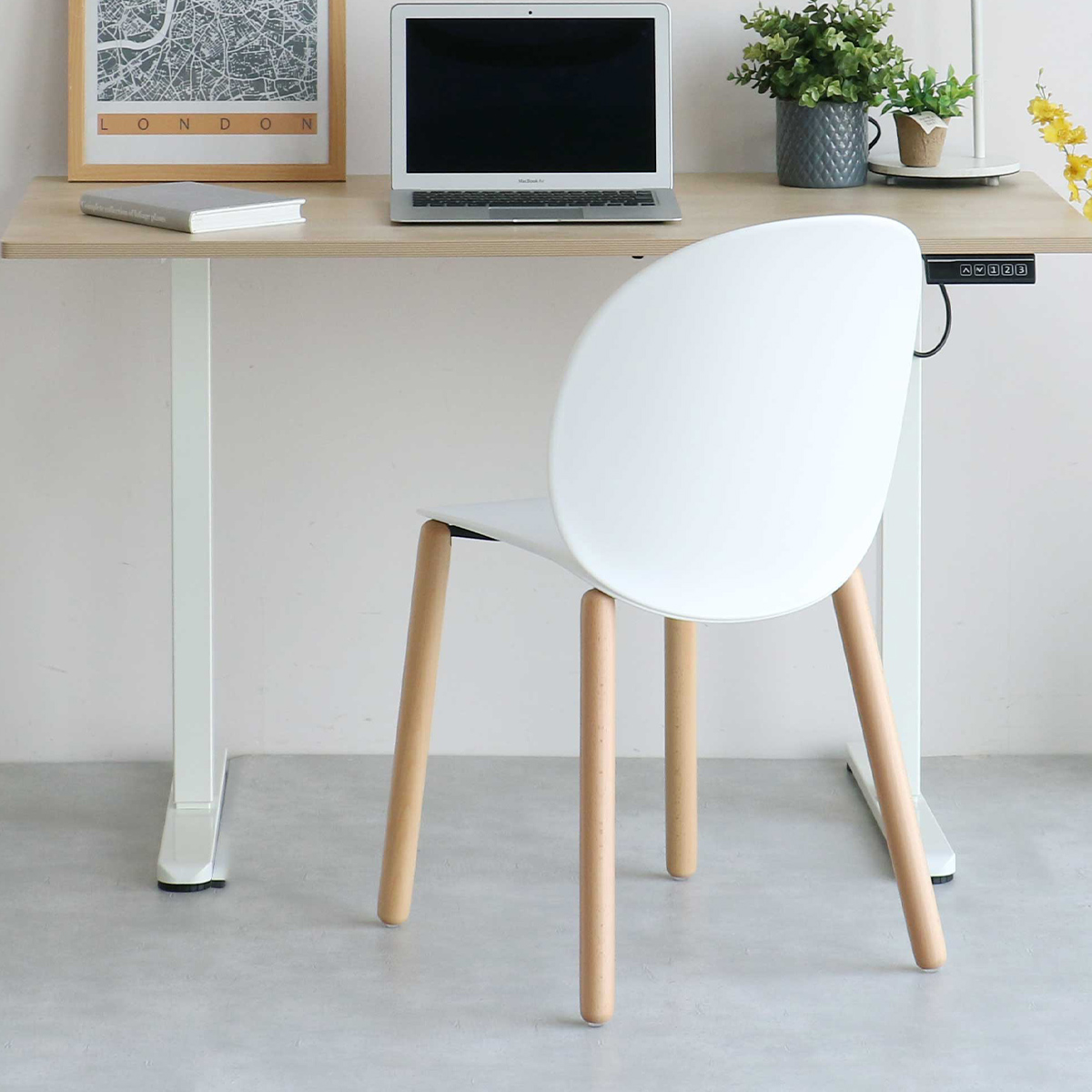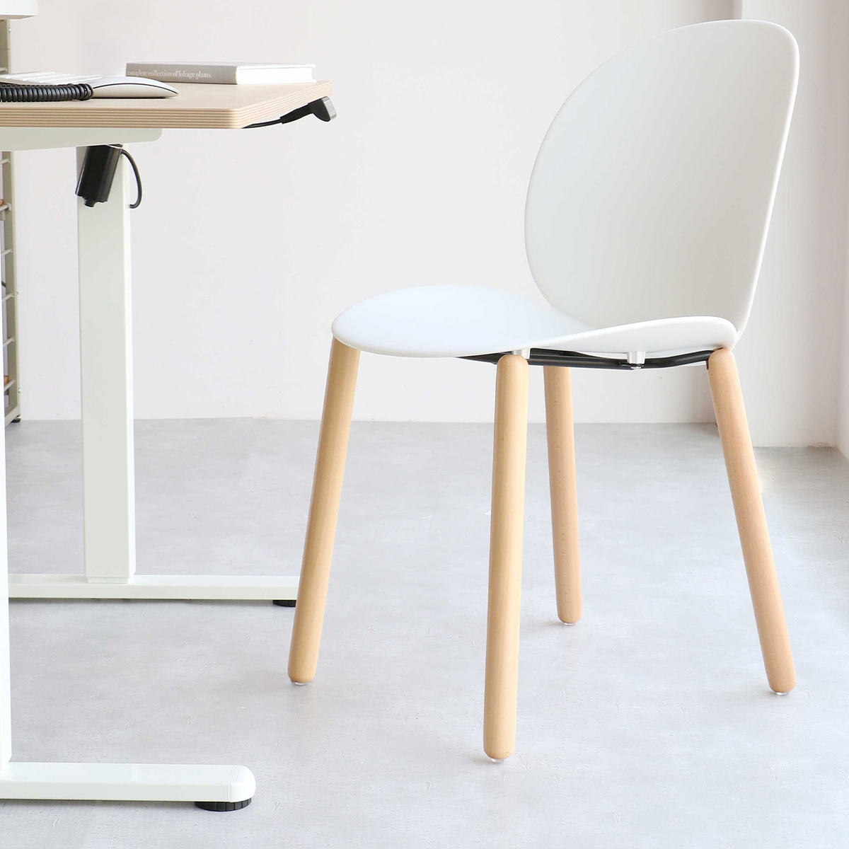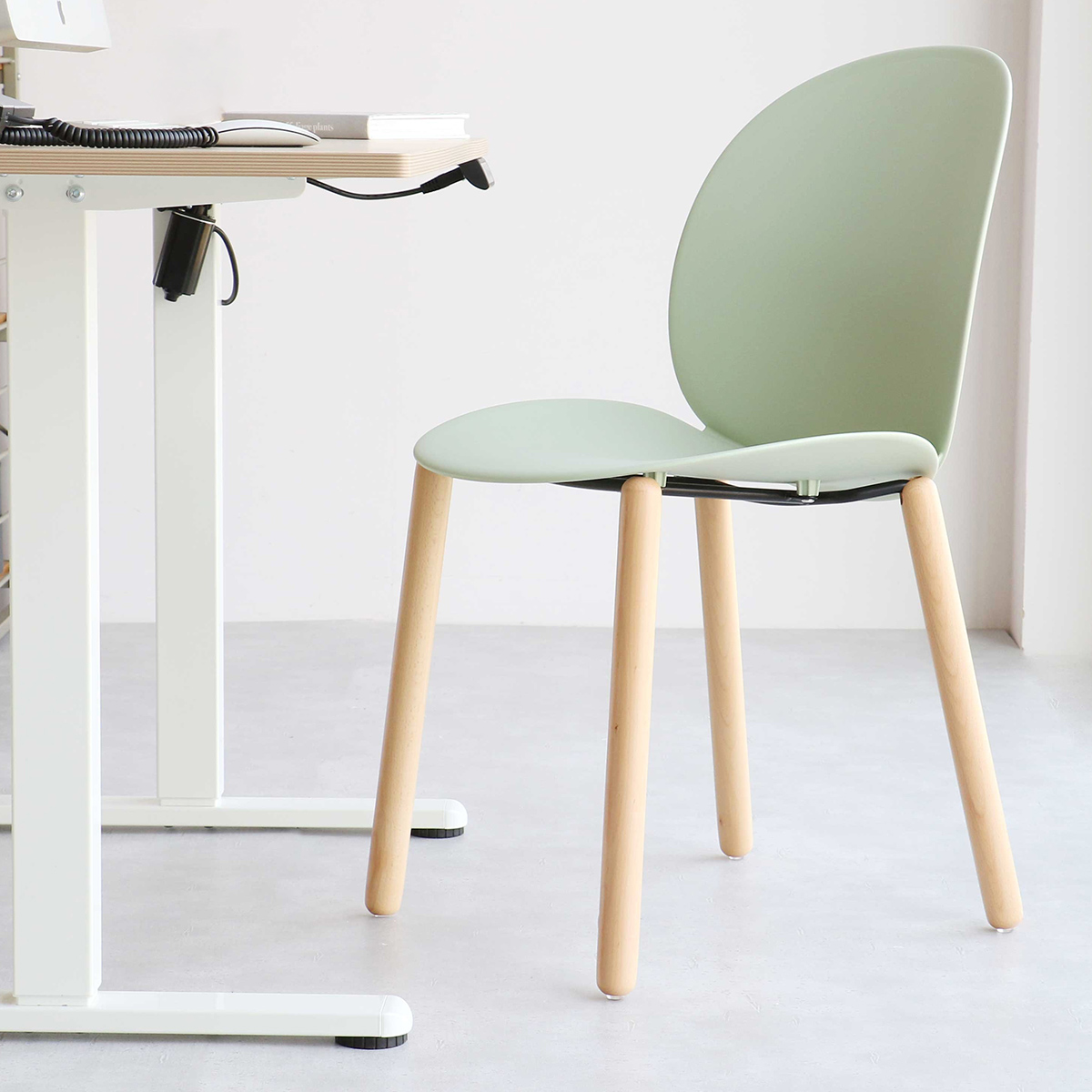 可愛らしいフォルムと優しい色合いで、幅広いビジネスシーンに自然と馴染む、使い勝手の良いチェアです。