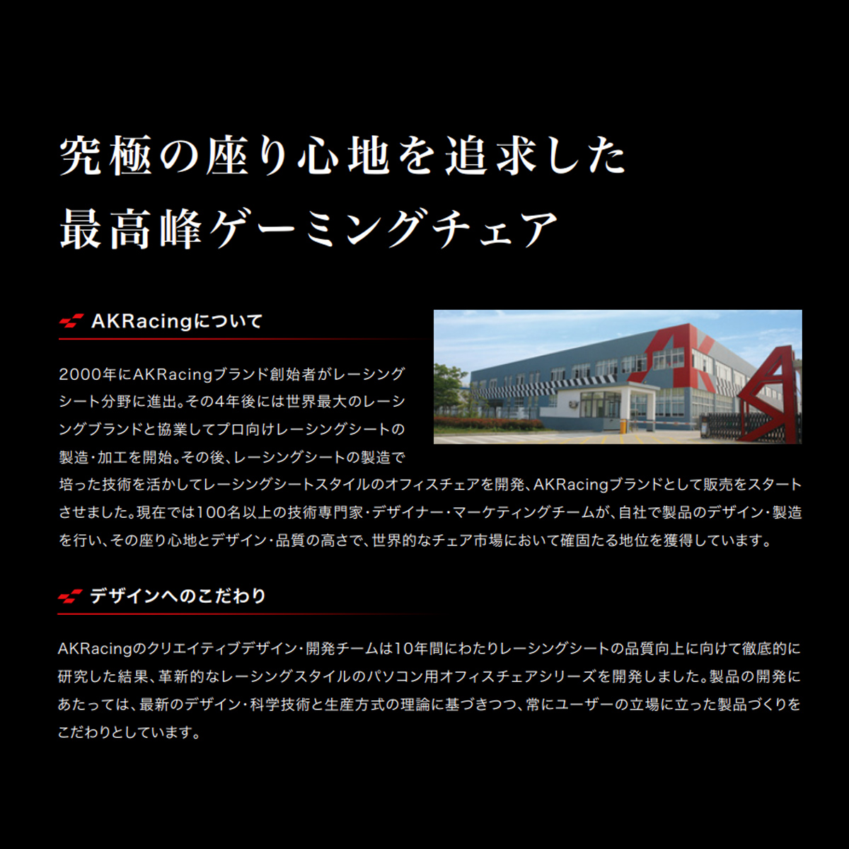 高機能パーツを盛り込んだ、AKRacing(エーケーレーシング)シリーズのハイグレードモデルです。