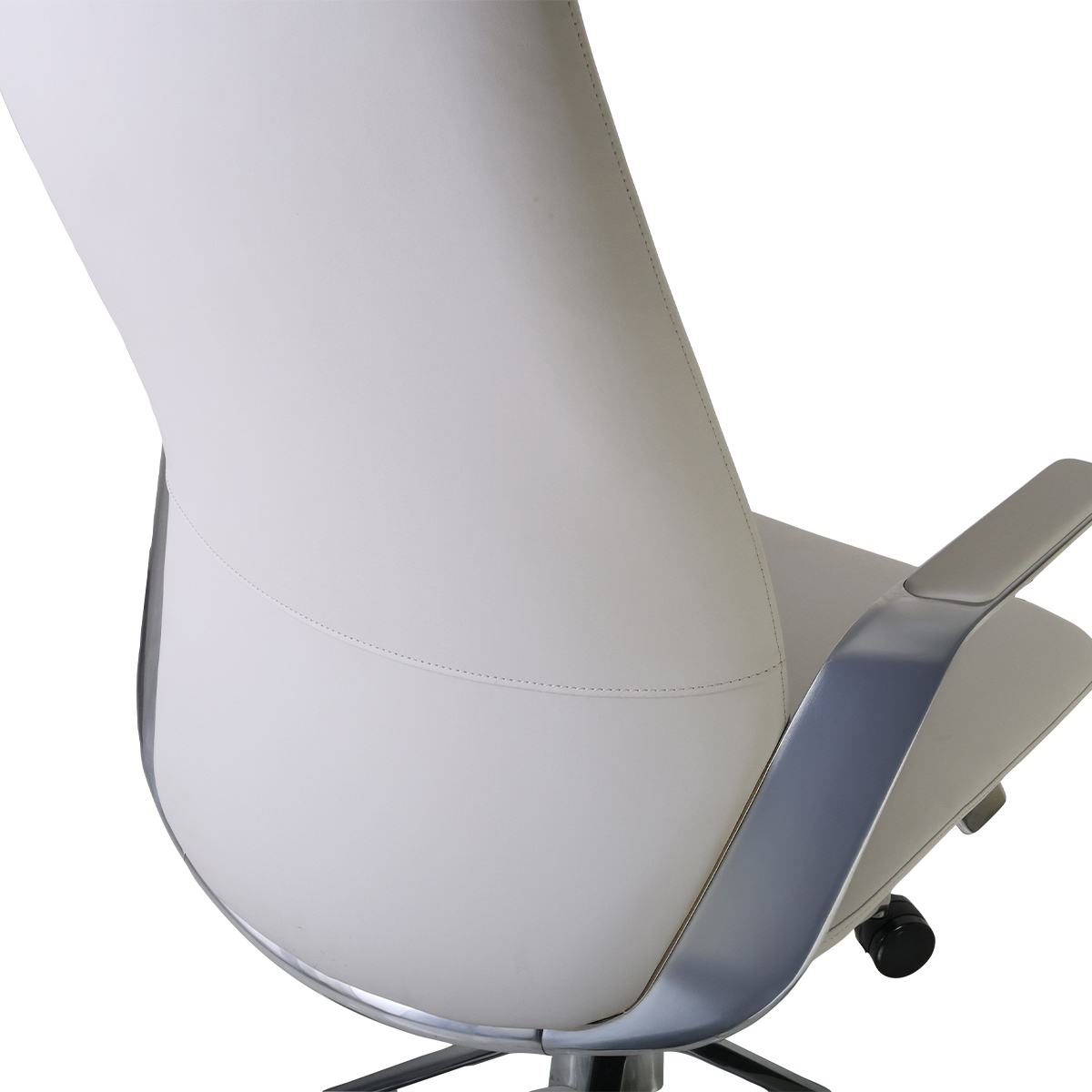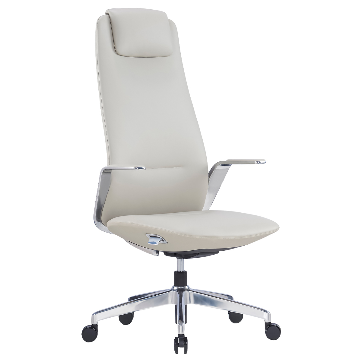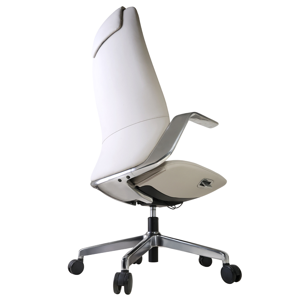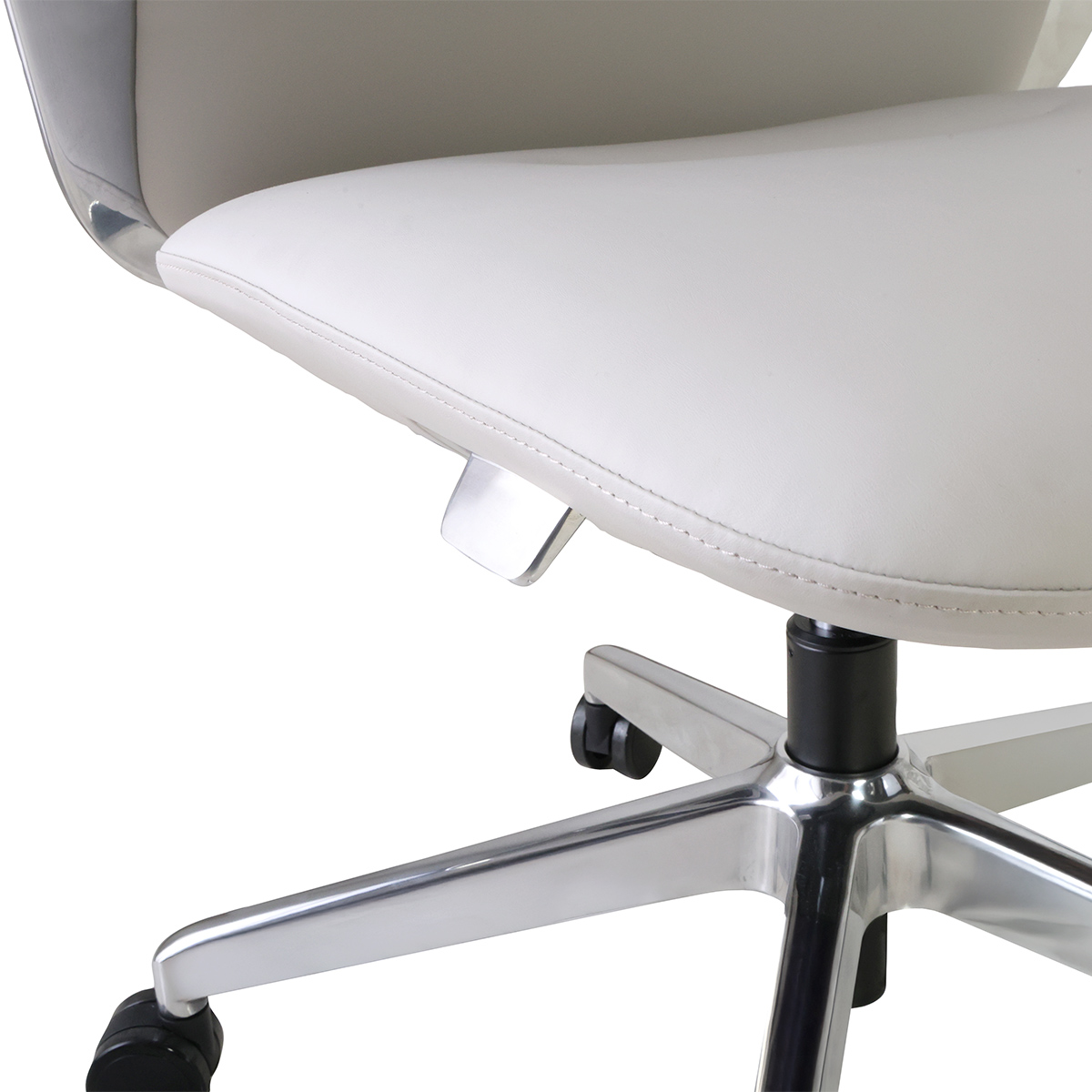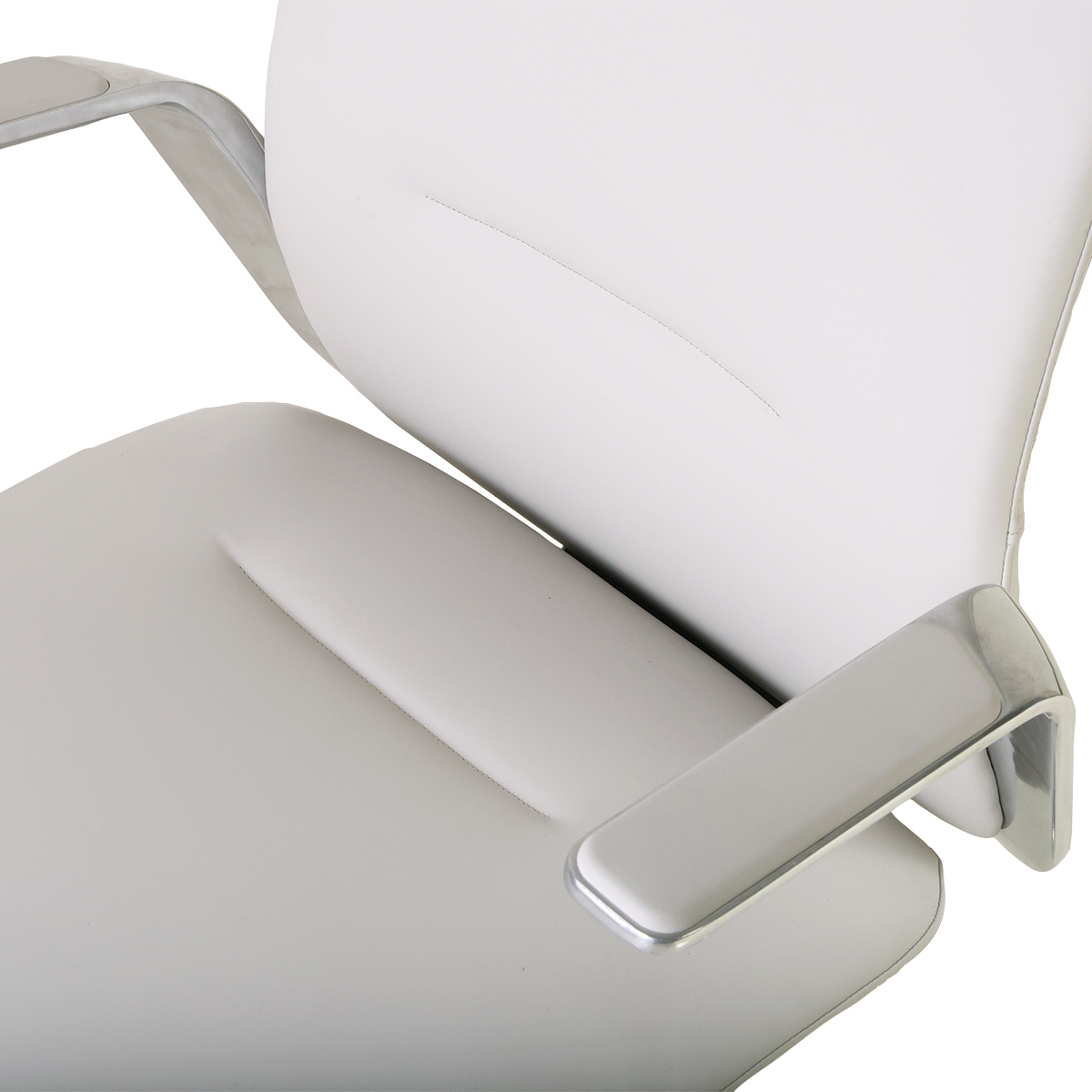 背もたれと座面には、柔らかな質感のアイボリーカラーのPUレザーを、肘や脚部にはアルミダイキャストを採用し、異素材のコントラストがチェア全体の印象を引き締め、モダンで洗練された佇まいを演出します。