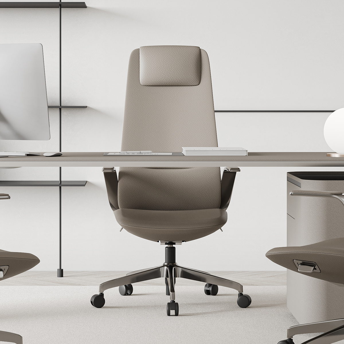 風合い豊かなPUレザーと流麗なフォルムが調和したハイバックチェアは、座る人のステータスを高めながら、上質なワークタイムを約束します。