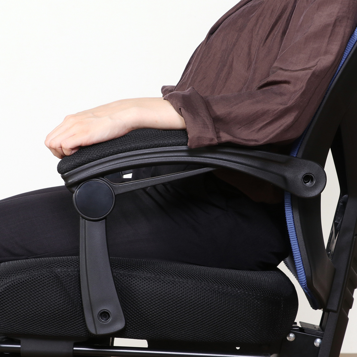 リクライニングに連動して高さの変わるアームは、クッション仕様になっており、長時間快適にお使いいただけます。
