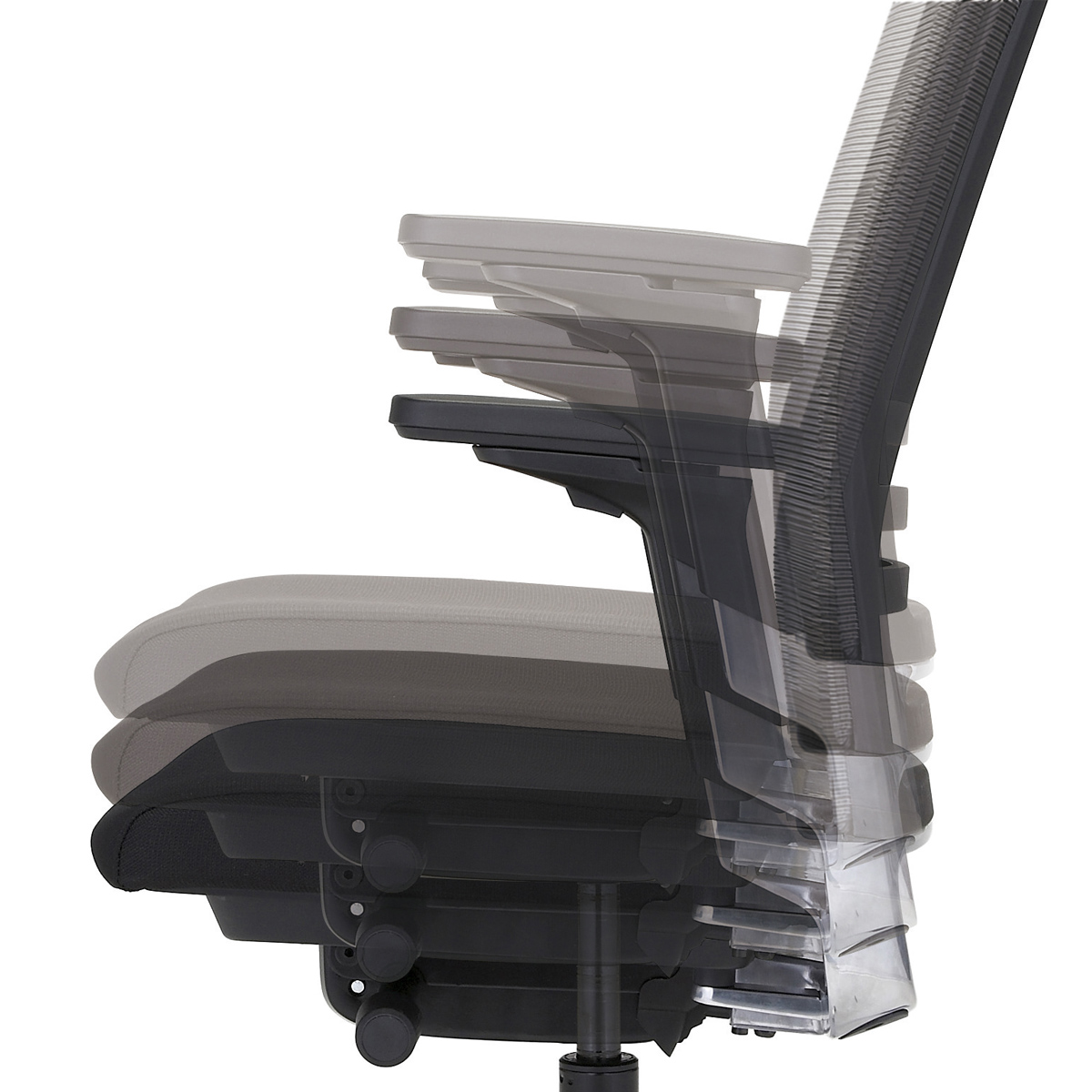 オフィスワークをサポートする、動的な座部と前後スライド機能付き座面を備えた高機能チェアです。