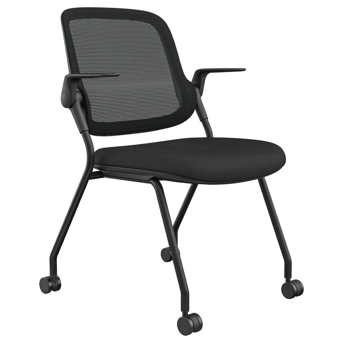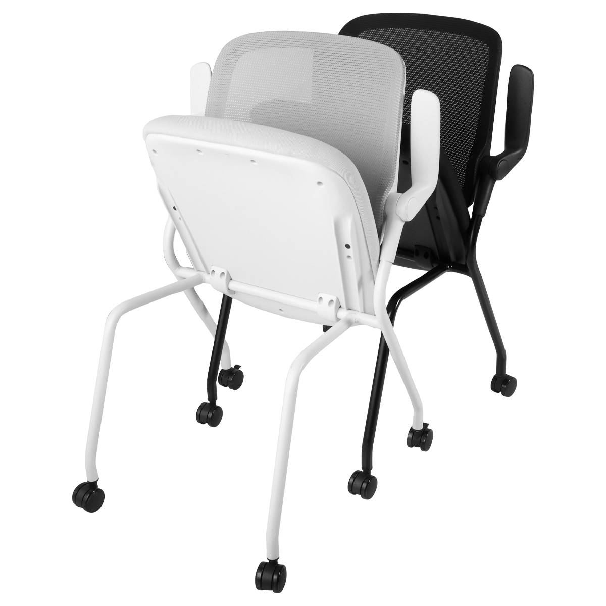 スタッキング・ネスティング収納に対応し、ロータリーアームレストやロッキング機能、メッシュ背など快適性と省スペース性を両立。