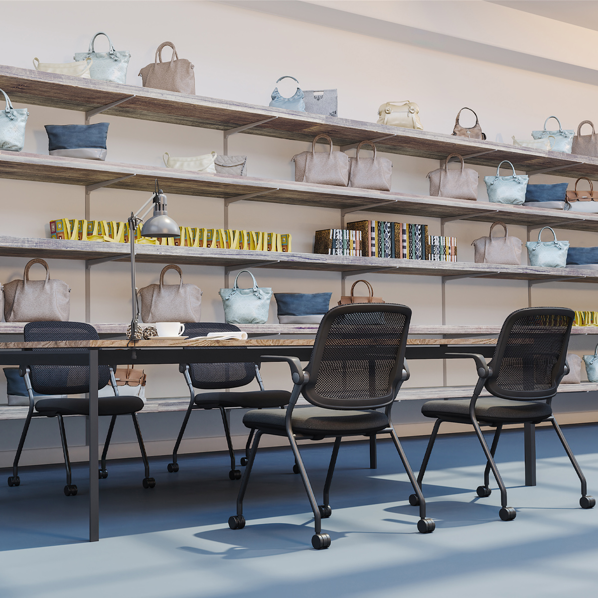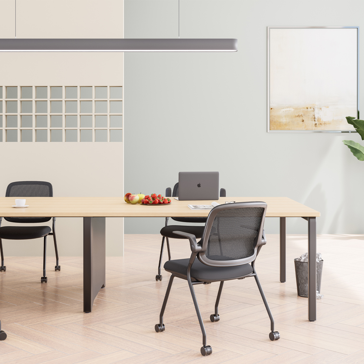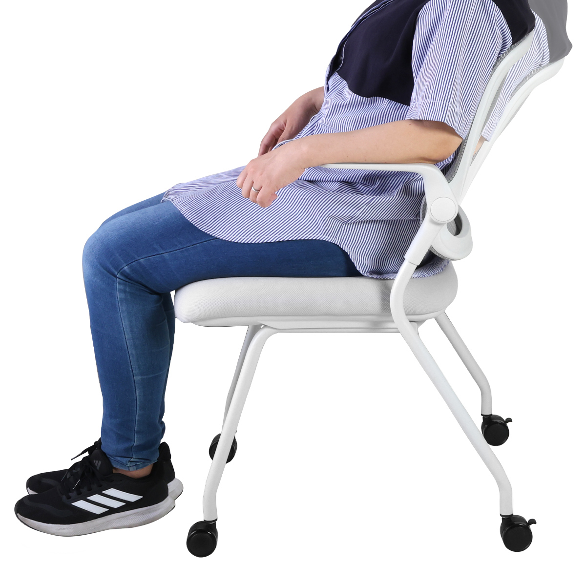 熱がこもりにくい緻密なメッシュを背もたれに採用し、長時間の会議や研修でも蒸れずに集中できます。