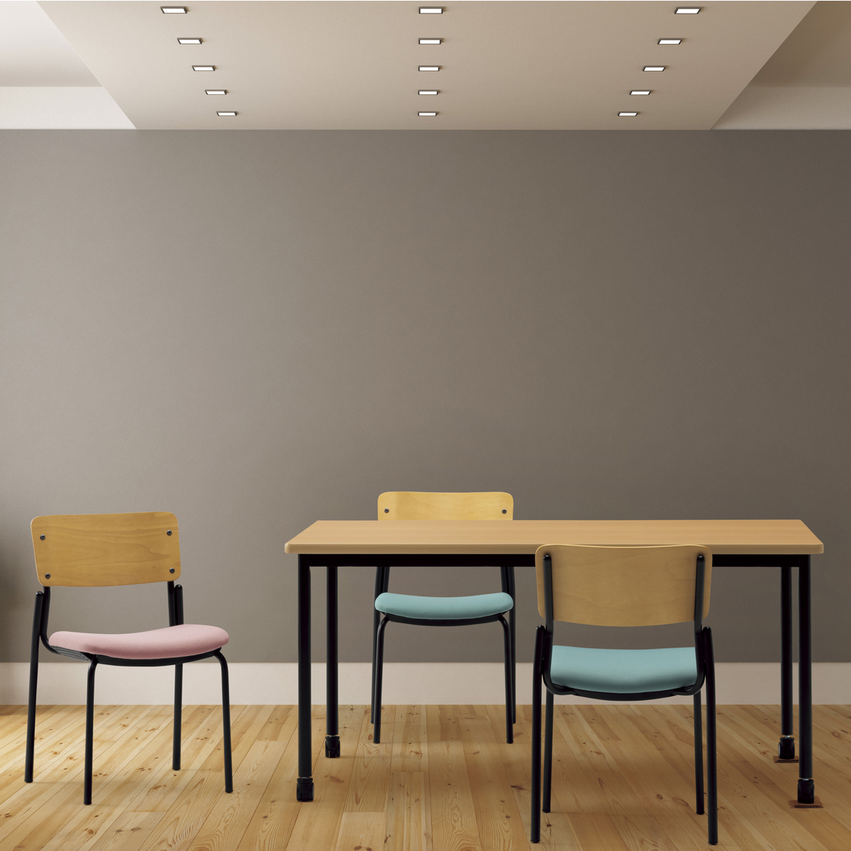 ナチュラルの背合板とカラー張地の組み合わせが優しい印象を、ブラウンの背合板とカラー張地の組み合わせはモダンな印象を与えてくれる、ミーティングチェアです。