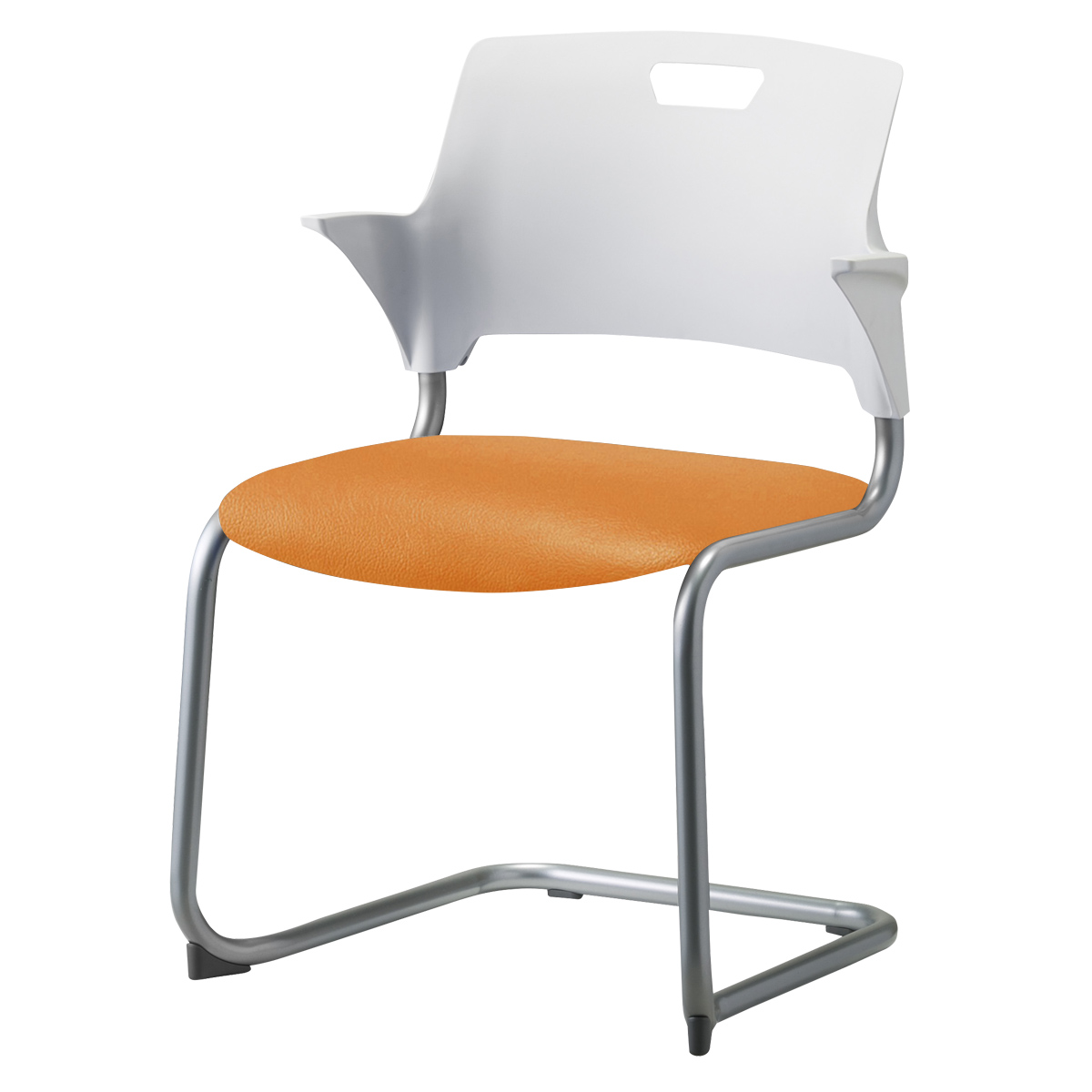 便利なハーフ肘と持ち手が特徴で、2色のフレームや、布張り、ビニールレザー張りなど豊富なパターンを誇るキャンチレバー脚チェア。
