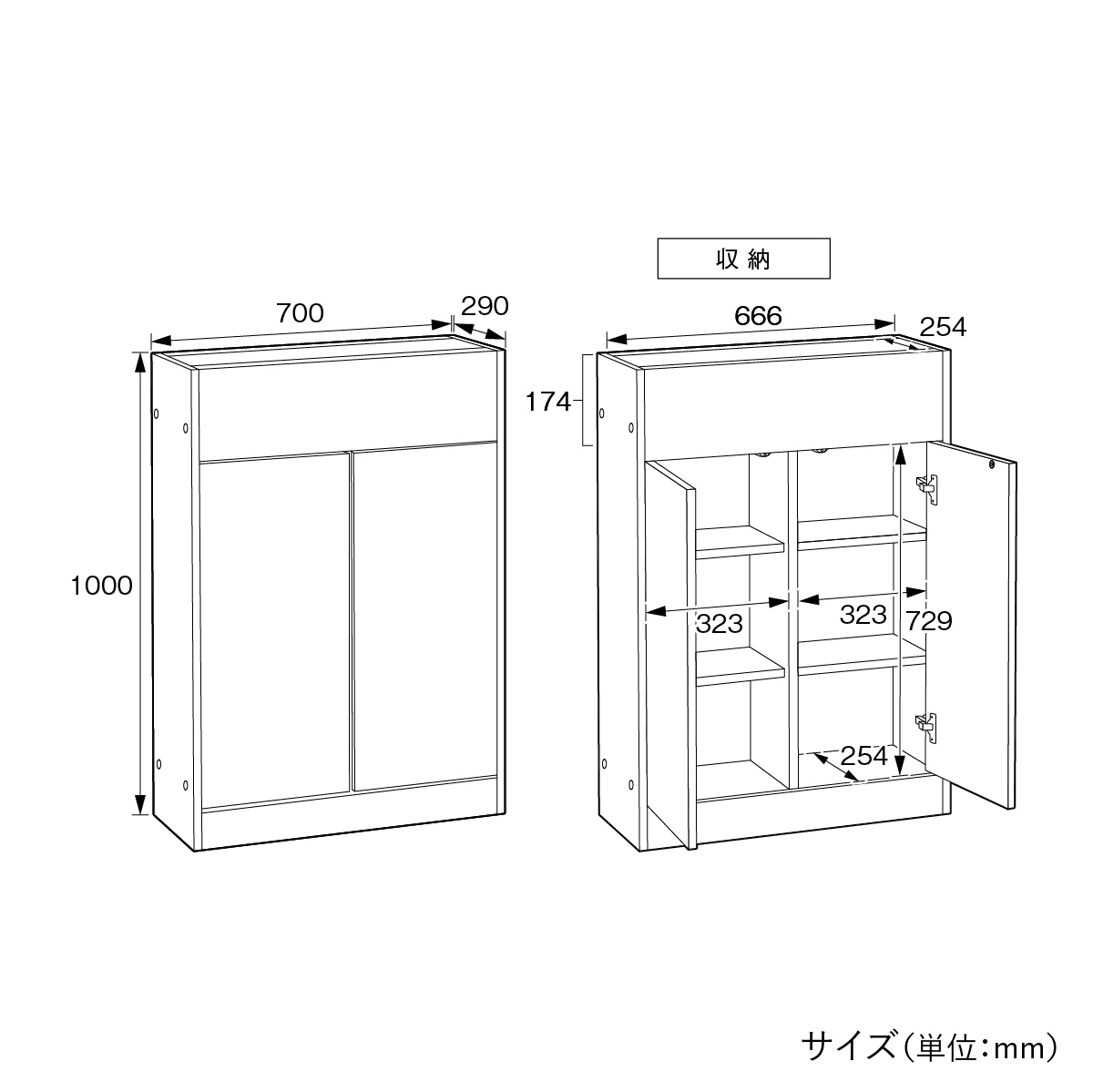 | 内寸法 | 上部プランター置き:W666×D254×H174mm キャビネット収納部:W323×D254×H729mm |