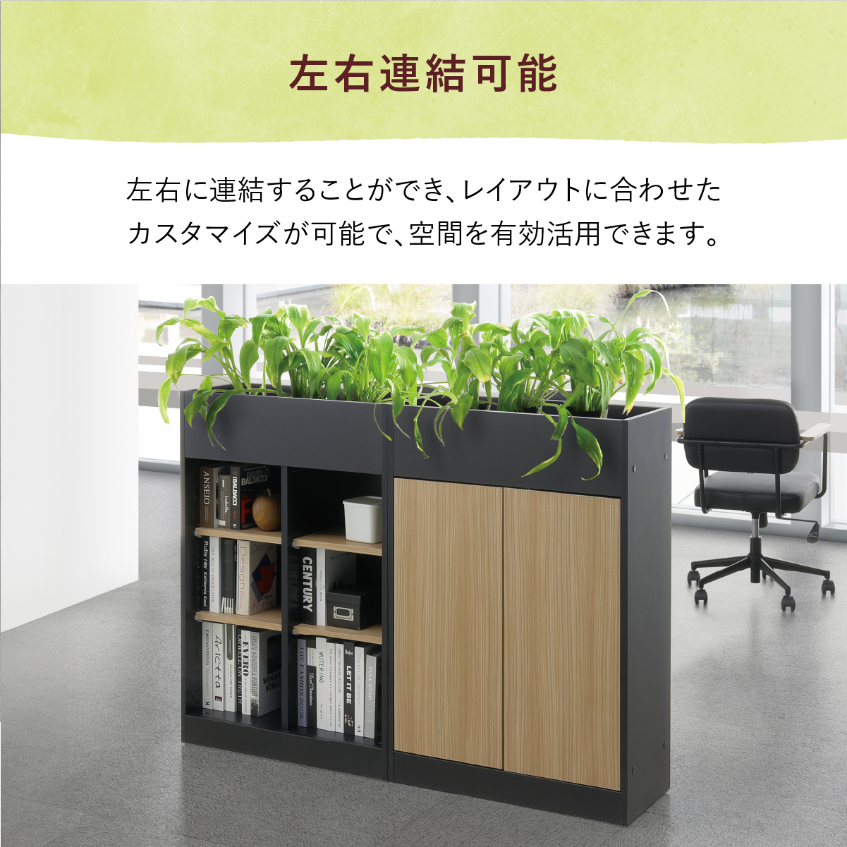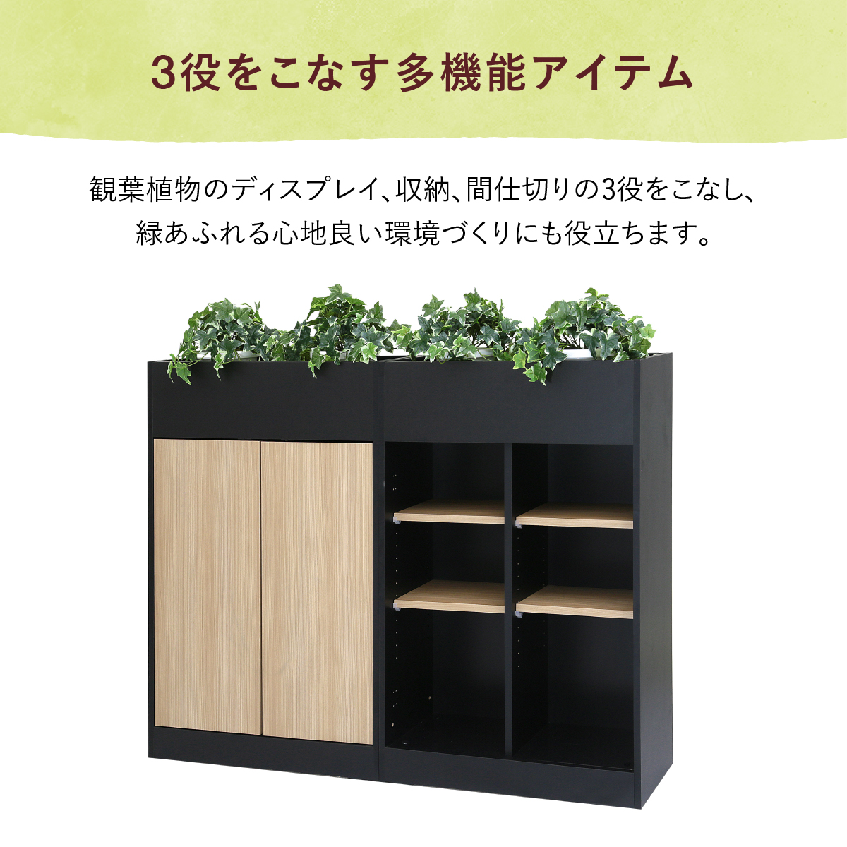 プランターパーテーション両開きキャビネットは、観葉植物のディスプレイ、収納、間仕切りの3役をこなす多機能アイテムです。