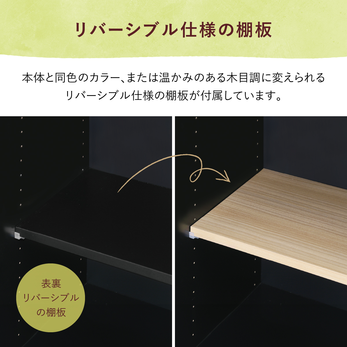本体と同色のカラー、または温かみのある木目調に変えられる、リバーシブル仕様の棚板が付属しています。