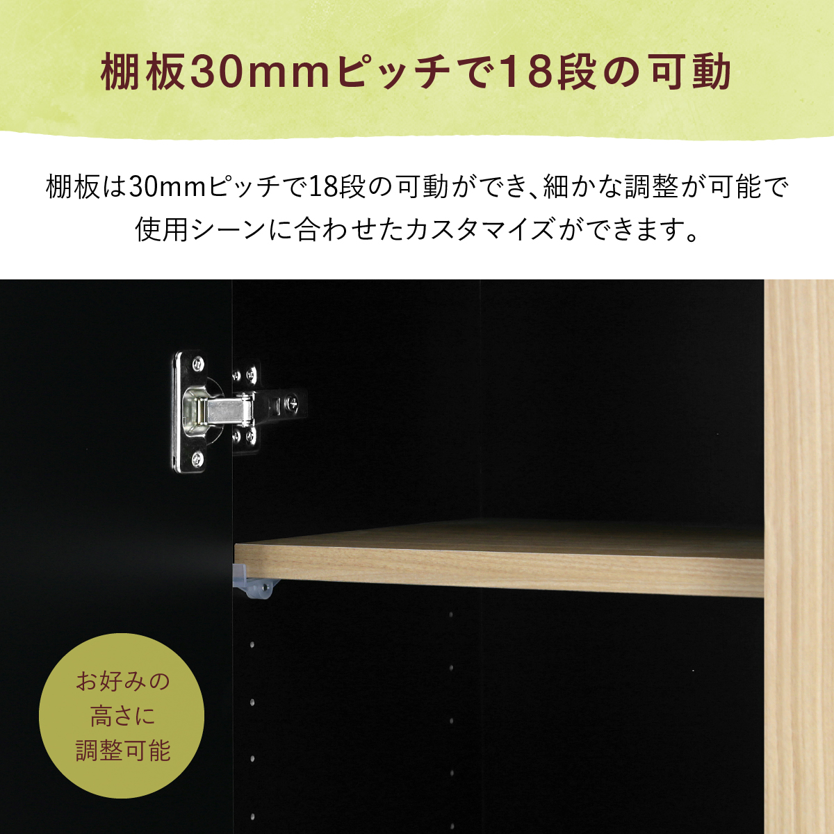 棚板は30mmピッチで18段の可動ができ、細かな調整が可能で、使用シーンに合わせたカスタマイズができます。