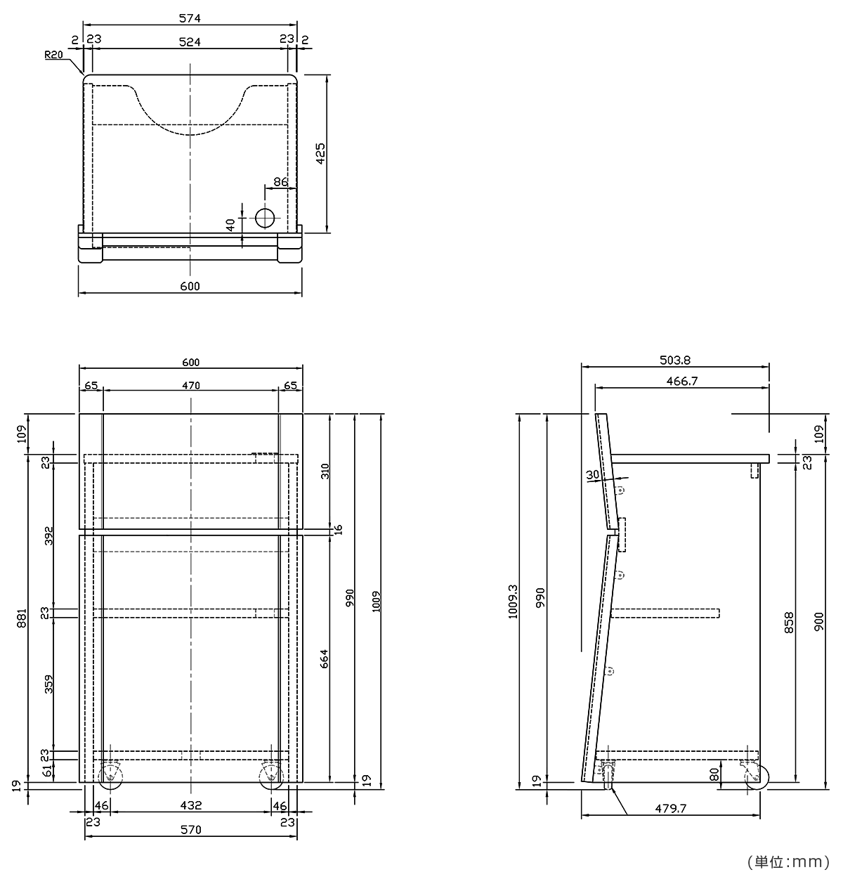 | 材質 | ナチュラル 本体:非塩ビシート張り ダークブラウン 本体:プリント化粧合板 天板・前板:非塩ビシート張り キャスター:φ75エラストマー樹脂 |