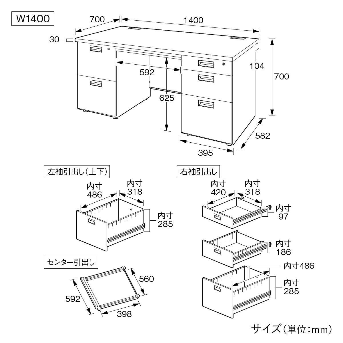 | サイズ | W1400×D700×H700mm 脚下寸法:625mm 脚間寸法:592mm |