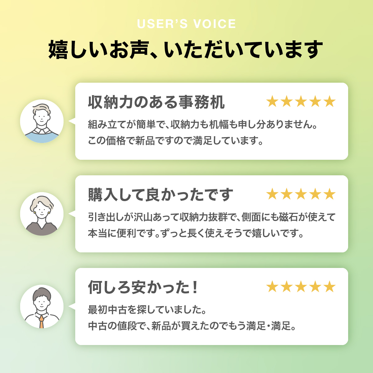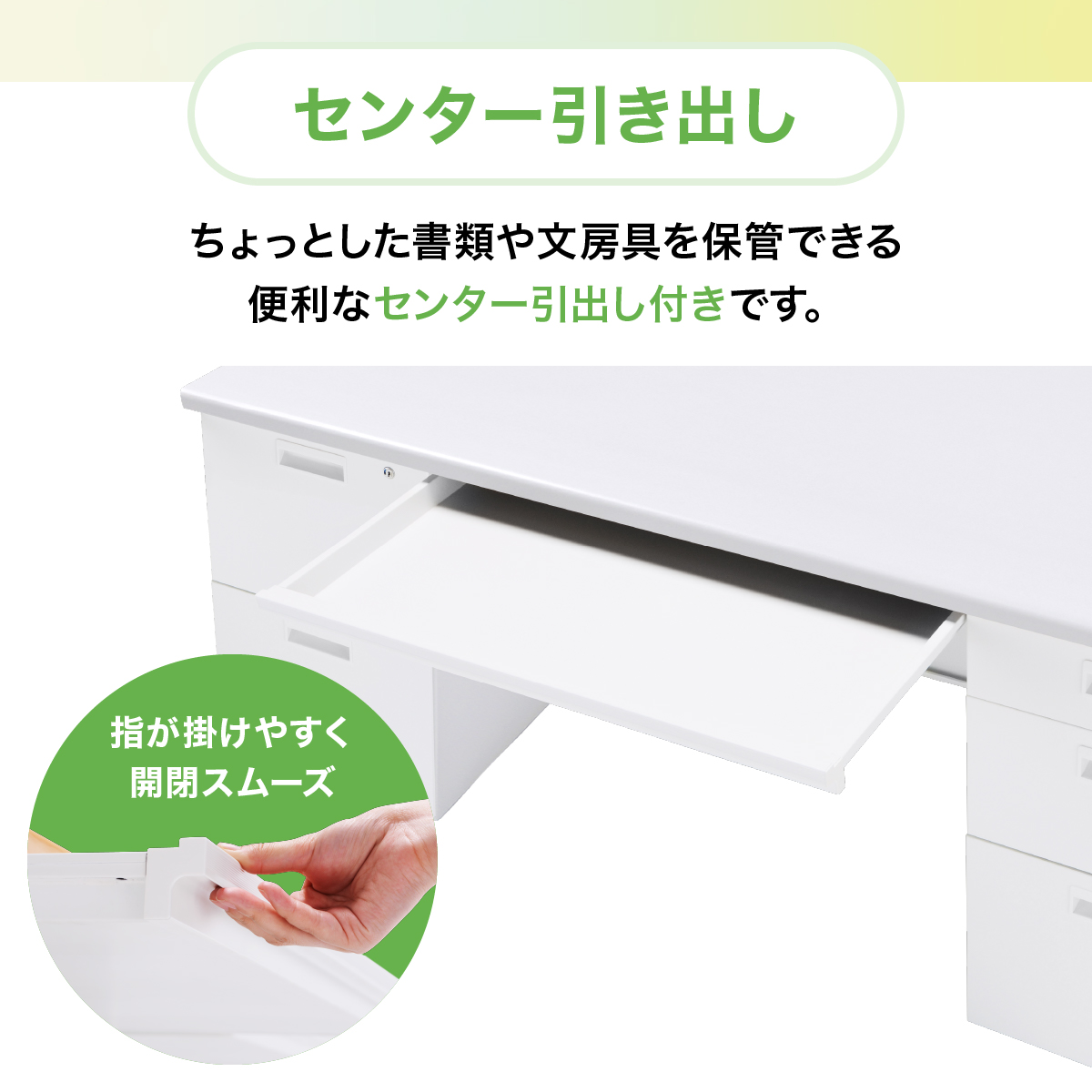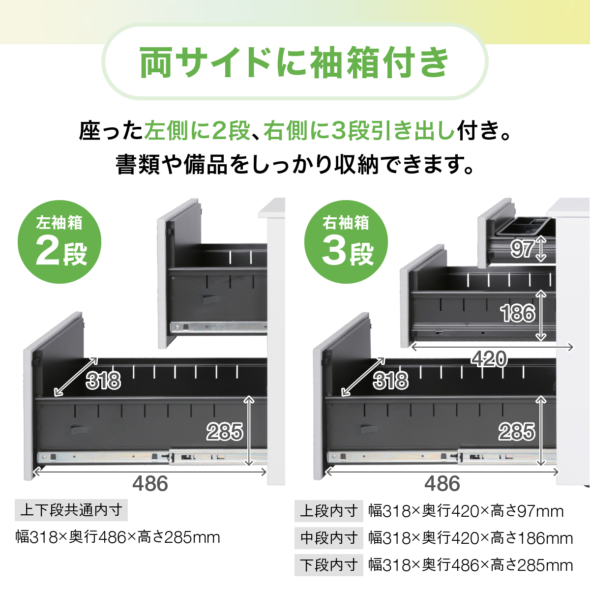 | 耐荷重 | 天板:150kg センター引出:3kg 右引出(上段):10kg 右引出(中段):15kg 右引出(下段):30kg 左引出(上下段):30kg |