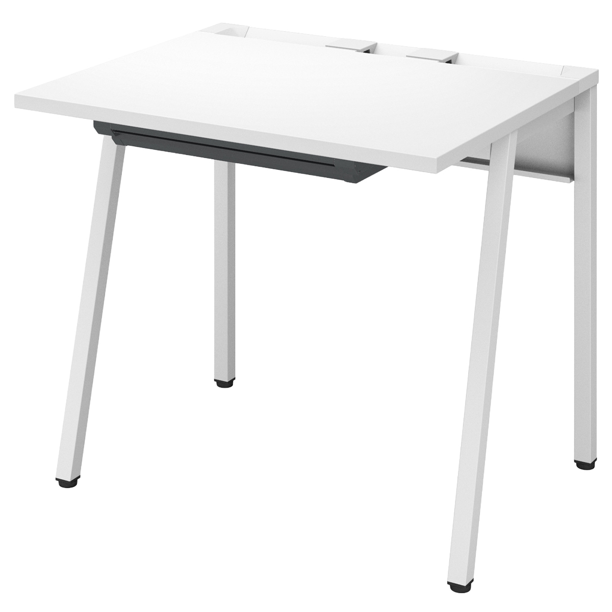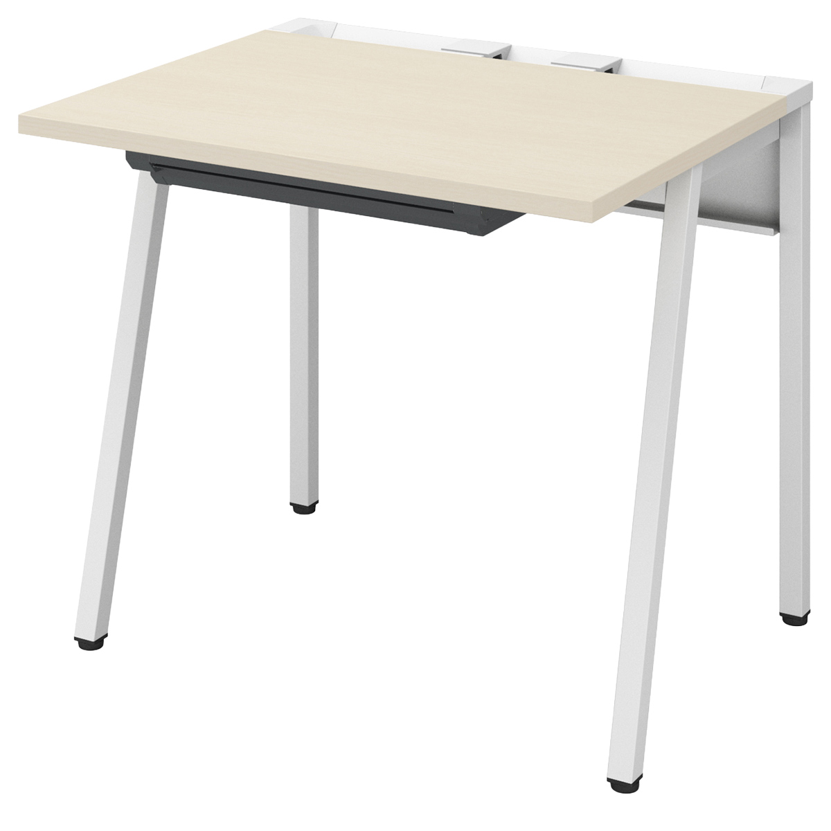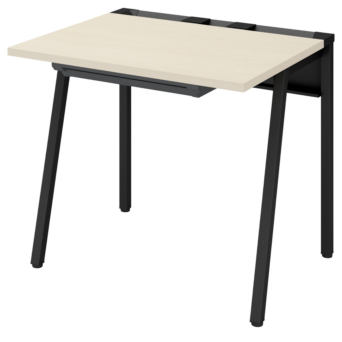 斜め脚のシンプルなデザインが空間をスッキリ見せ、通路脇や共有スペースのサブデスクとして既存家具とも調和します。