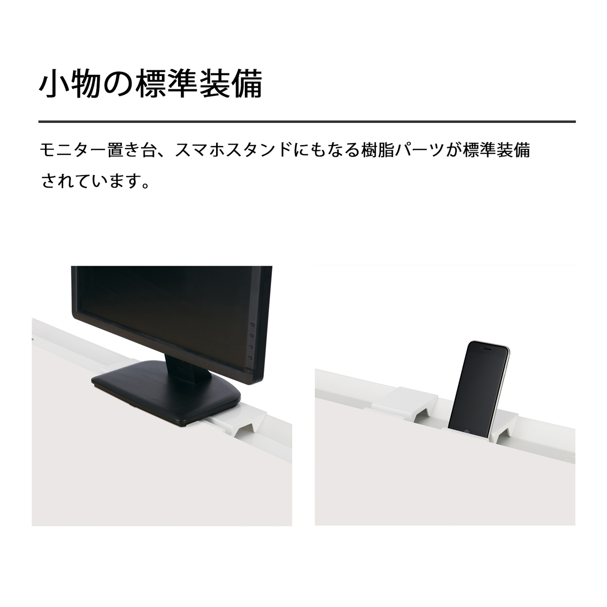 モニター置き台、スマホスタンド、タブレットホルダーにもなる便利な樹脂パーツが標準装備されており、デスク周りを快適に整えることができます。