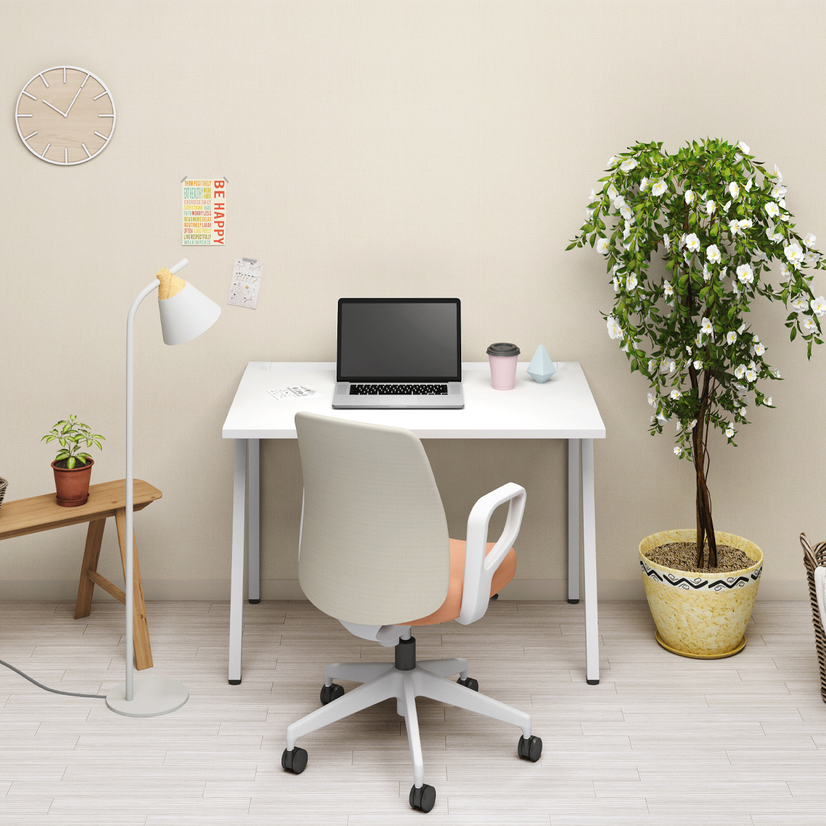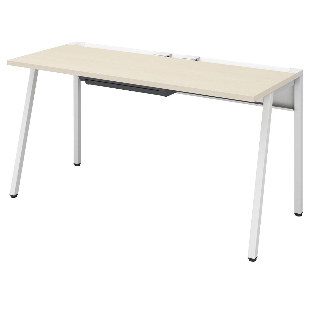 斜め脚のシンプルなデザインが空間をスッキリ見せ、通路脇や共有スペースのサブデスクとして既存家具とも調和します。
