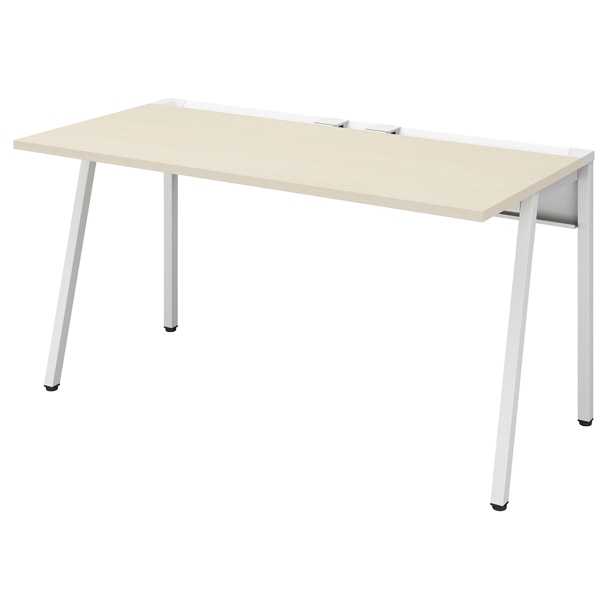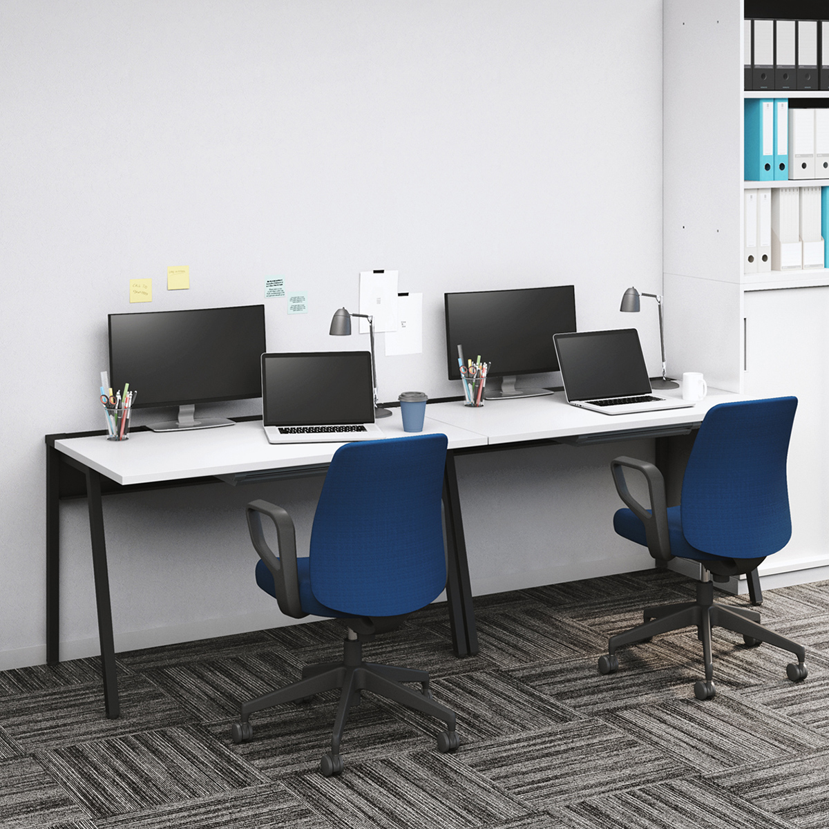 斜め脚のシンプルなデザインが空間をスッキリ見せ、通路脇や共有スペースのサブデスクとして既存家具とも調和します。