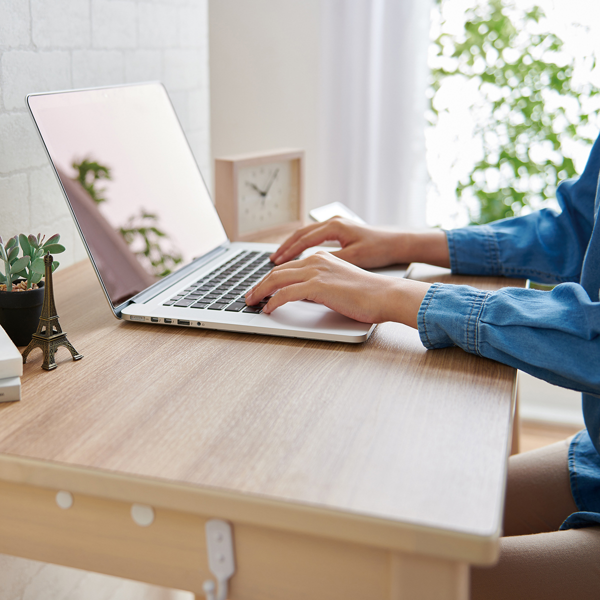 なお、天板と前板には高圧メラミンを使用しており、メラミンの硬度は9Hとキズに強いだけでなく、熱や汚れにも強いので、子ども用の学習塾などの教育施設はもちろん、テレワーク用としてもオススメの1台です。