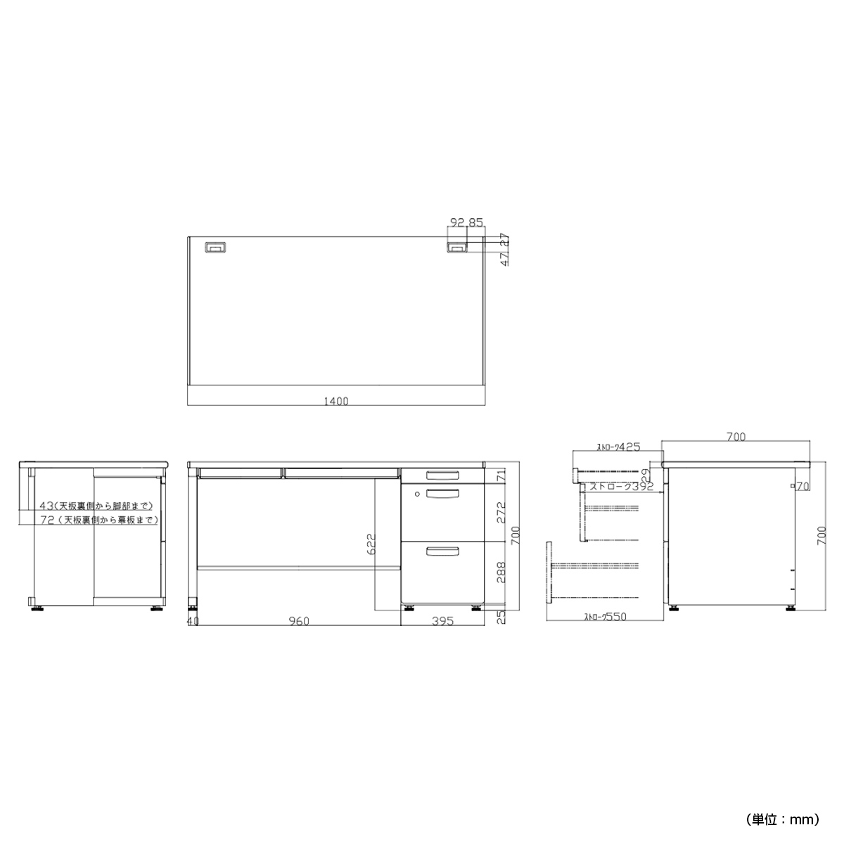 | 内寸法 | 天板厚さ:29mm 下肢空間:W960×D605×H622mm 引出(センター):W855×D382×H35mm 引出(左)W355×D382×H35mm 右袖(上段)W328×D435×H59mm 右袖(中段)W318×D435×H265mm 右袖(下段)W318×D540×H265mm |