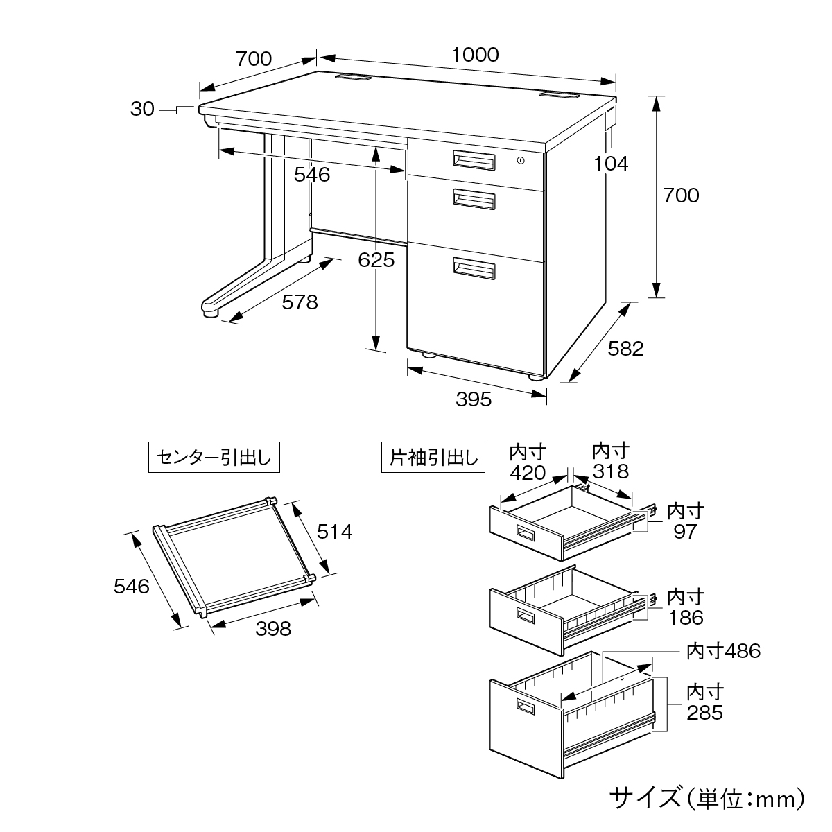 | サイズ | W1000×D700×H700mm 脚下寸法:625mm 脚間寸法:546mm |