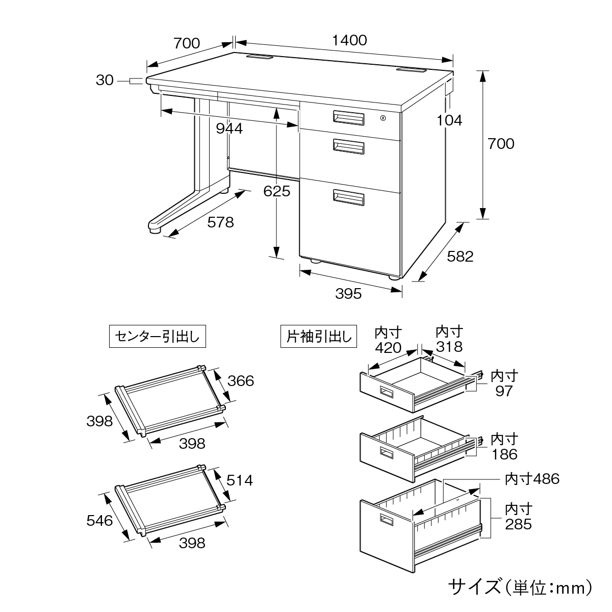 | サイズ | W1400×D700×H700mm 脚下寸法:625mm 脚間寸法:944mm |