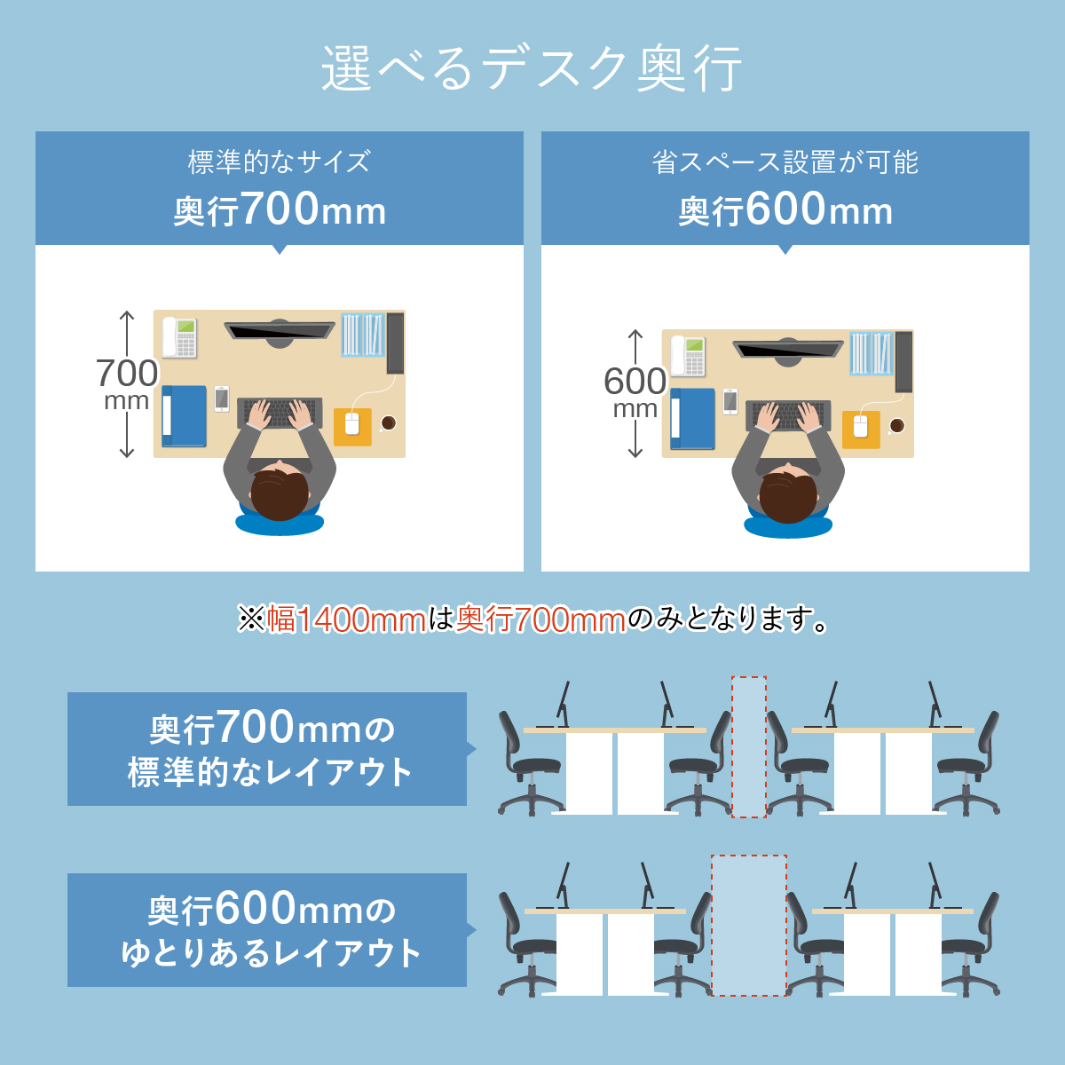 幅1000mmタイプは、奥行き600mmと700mmの2タイプがありますので、作業スペースやレイアウトに合わせてお選びください。