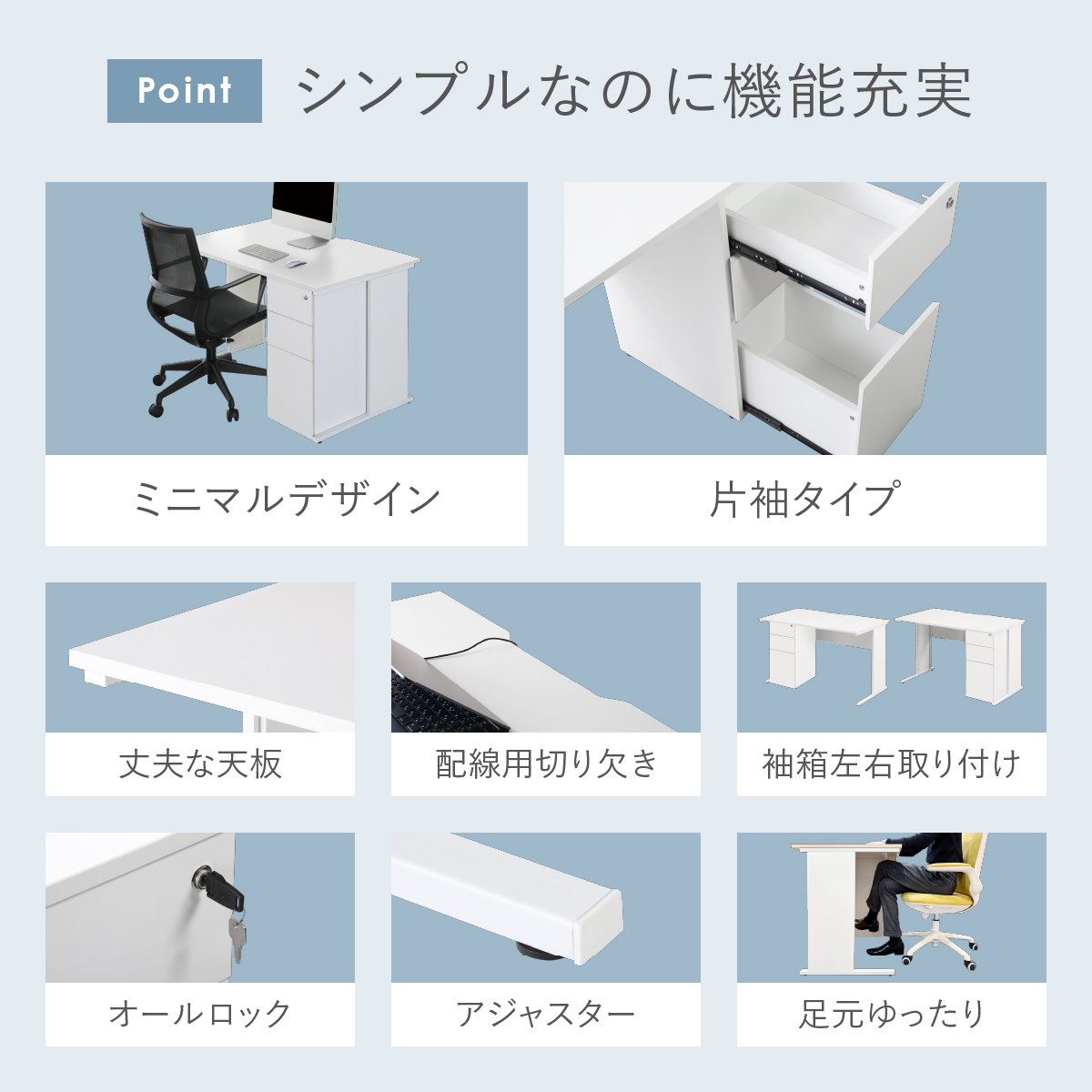 収納と機能性を強化した片袖タイプは、オフィスの規模を問わず、幅広いシーンで活躍することでしょう。