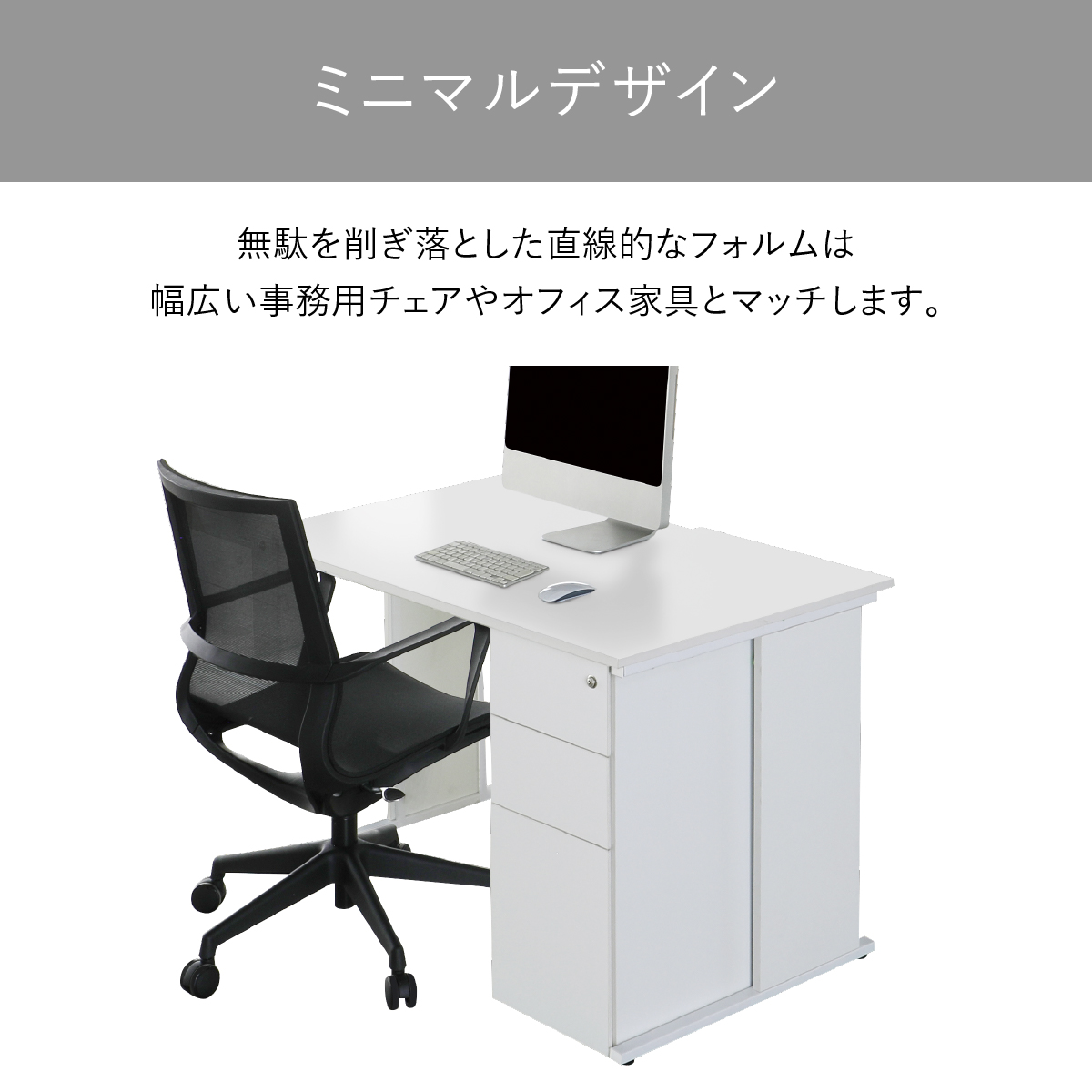 キズや汚れに強いメラミン化粧板の天板、配線を美しく解決する設計、同時に施錠可能な引出しなど、使い勝手と美しさを兼ね備えました。