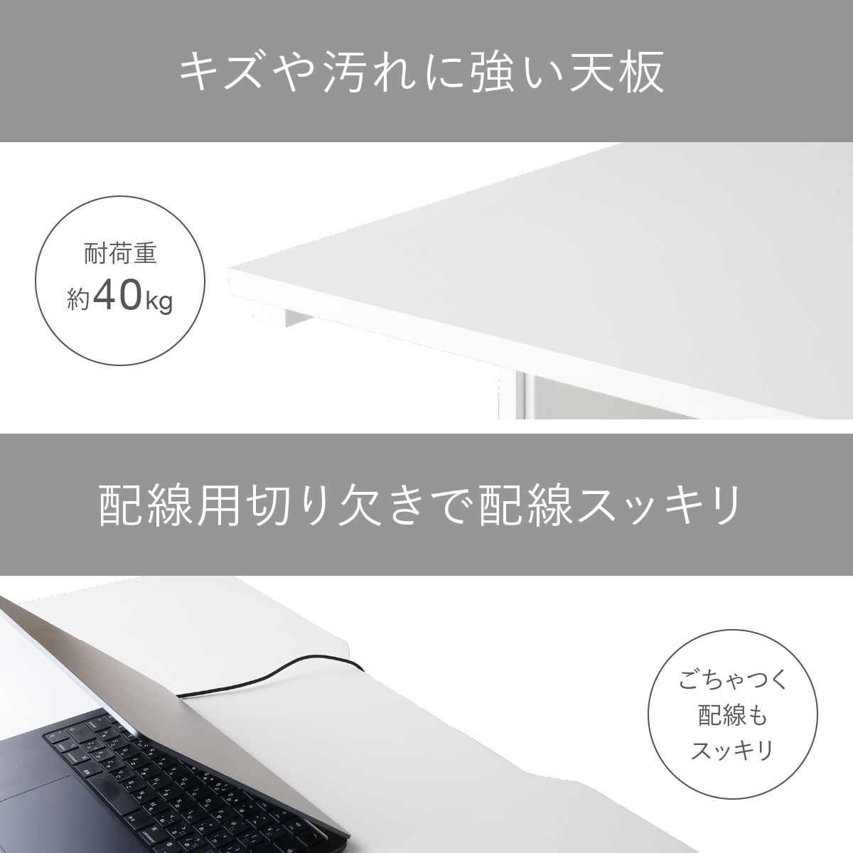天板奥の切欠きがあることで、壁にぴったりデスクをつけても配線を逃がせ、すっきりとした空間を演出します。
