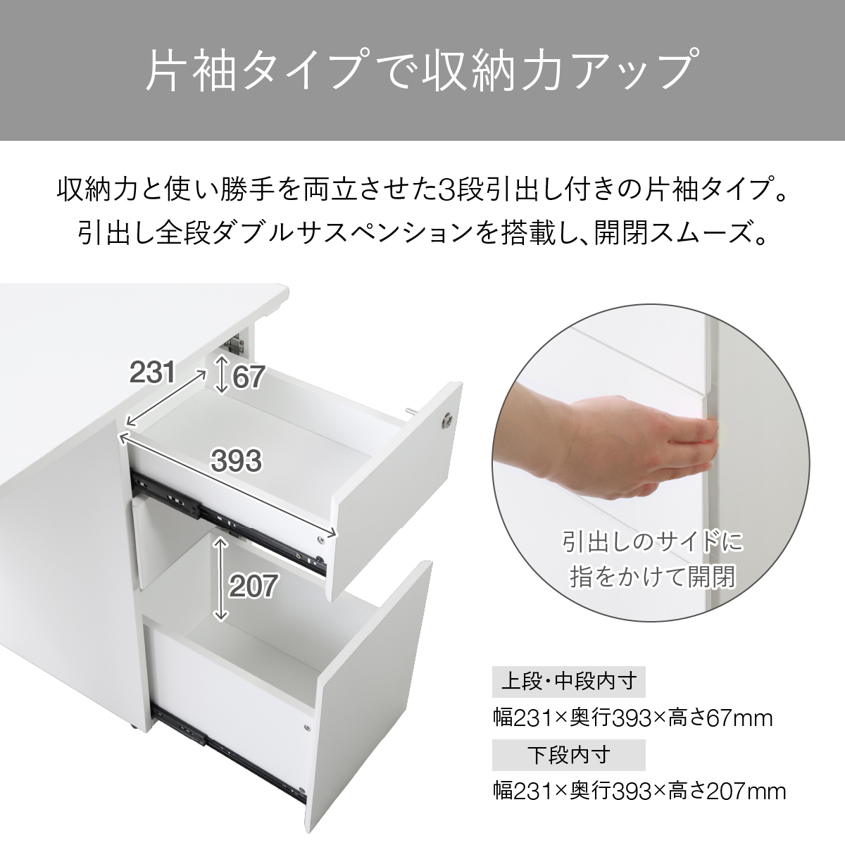 片袖部分には、ホワイトカラーの3段引出し袖箱を搭載し、全段ダブルサスペンションレール付きでスムーズに引き出せるほか、オールロック機能により1つの鍵操作で全段を同時に施錠可能なので、セキュリティ面でも安心です。