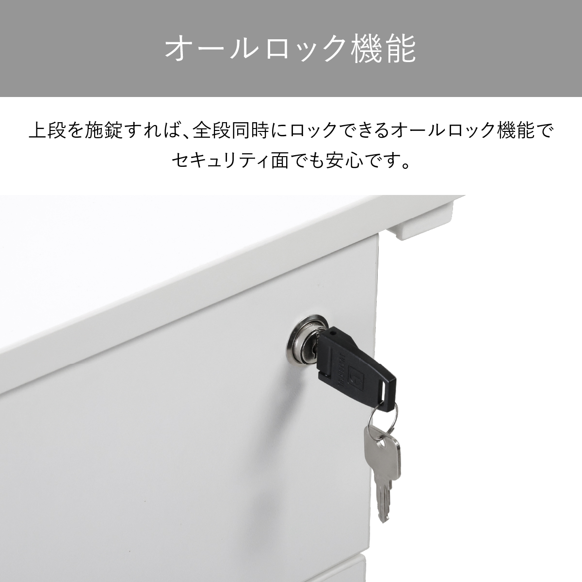 引出しはオールロック機能により、1つの鍵操作で全段を同時に施錠可能なので、セキュリティ面でも安心です。