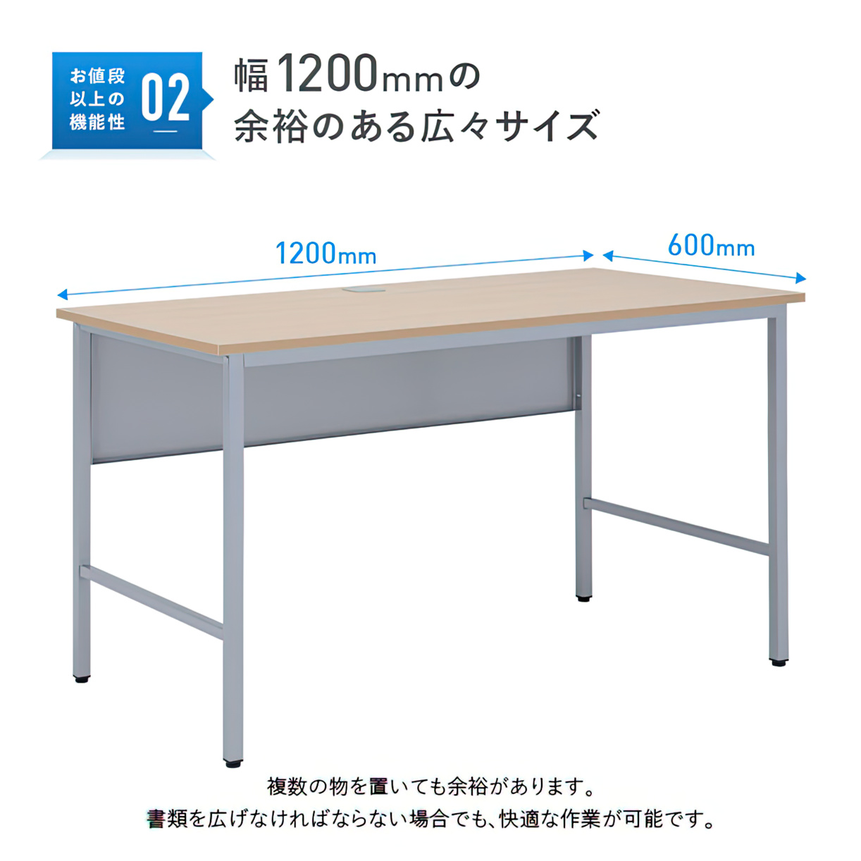 幅1200mmのワークデスクは、パソコンとモニター、ビジネスフォンはもちろん、周辺機器を設置しても十分な広さが確保できますので、ちょっとした単純作業から腰を据えた事務作業まで、これ一台で可能です。