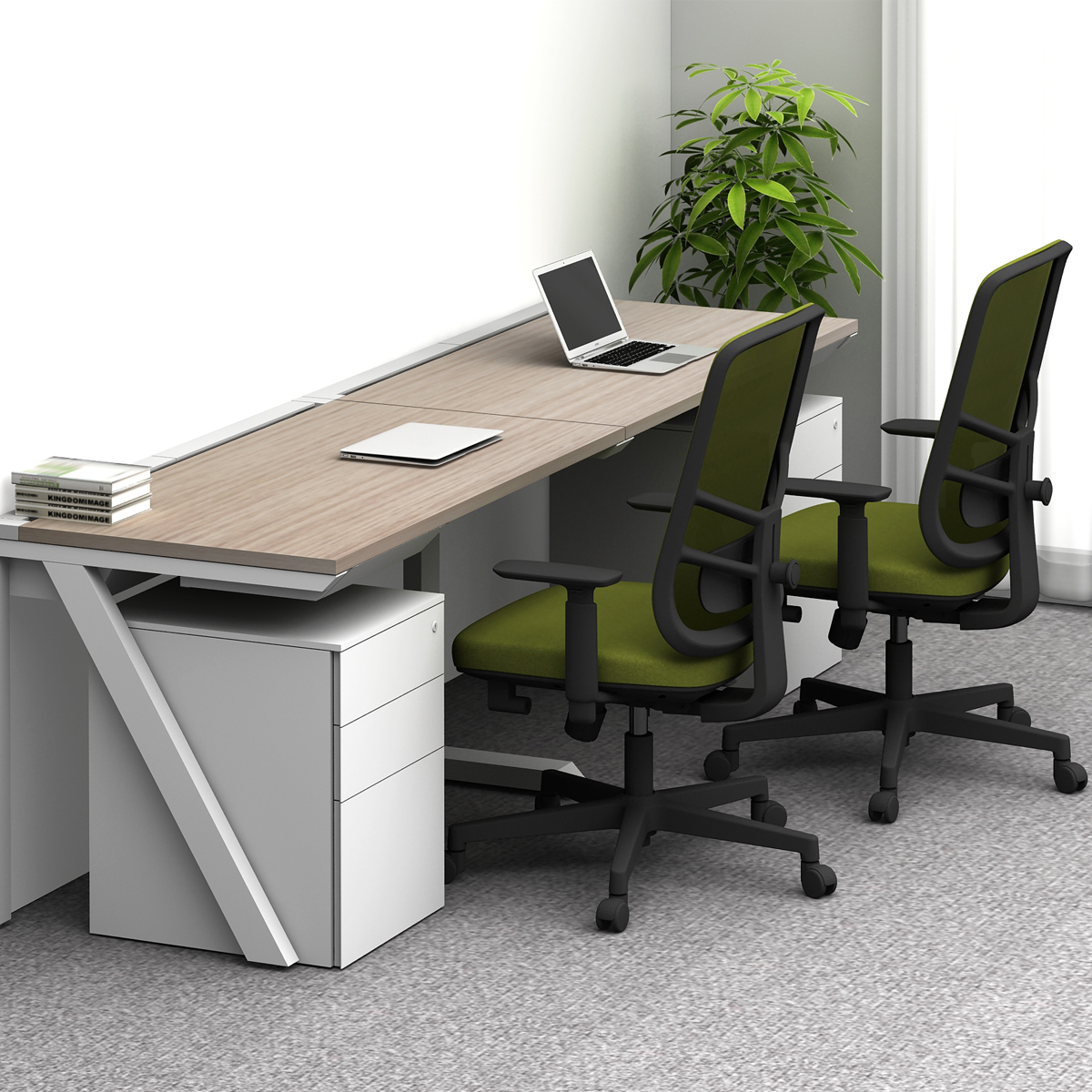 手前側にきれいに伸びるサイドのスチール脚が印象的で、オフィス空間をスタイリッシュに演出します。