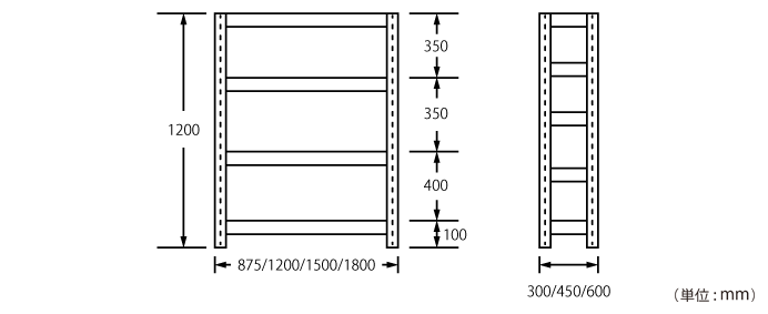 | 材質 | スチール製(棚板厚:0.8mm、アングル:口40×40mm、厚2.0mm) |